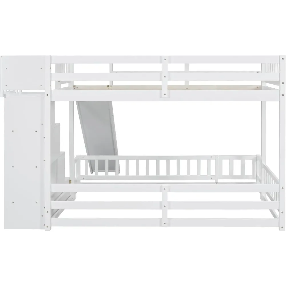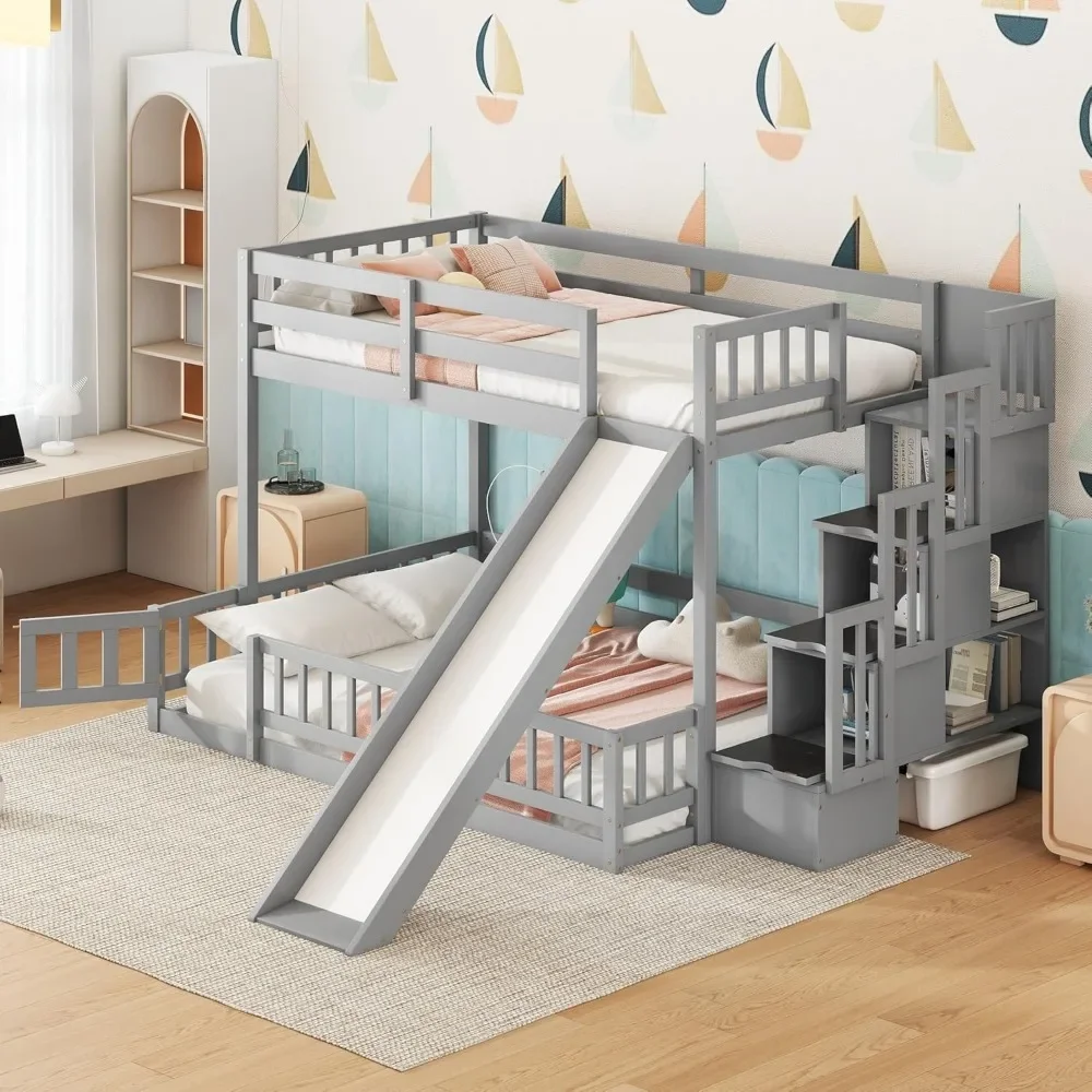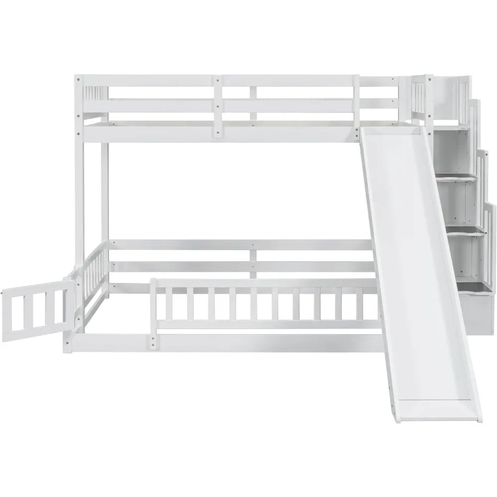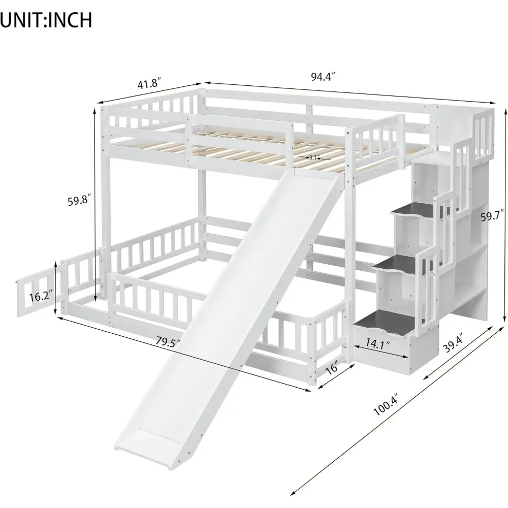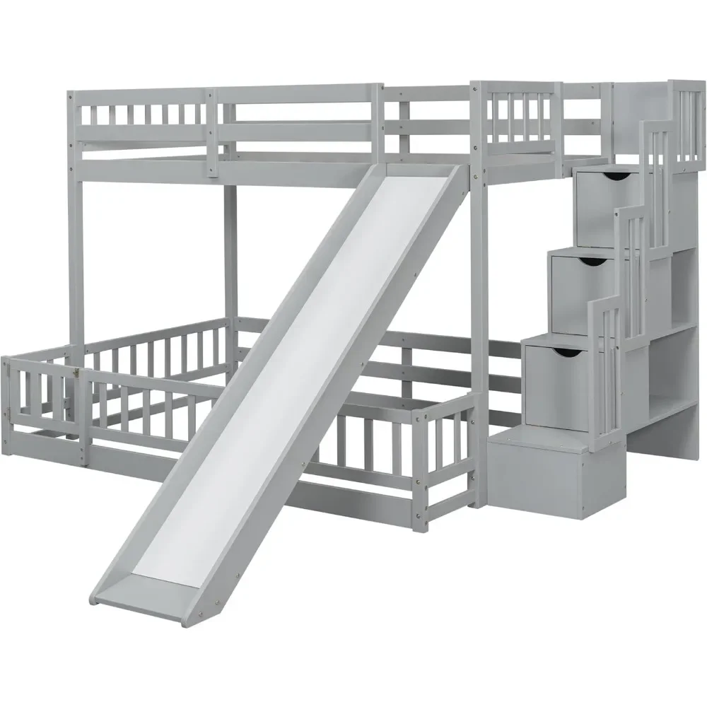 - Unique Bunk Bed Design with Slide: Our twin-over-full bunk bed offers a unique sleeping arrangement with an upper twin bed and a spacious floor-level full bed, both equipped with guardrails for safety. The design minimizes disturbance between sleepers and ensures optimal comfort. Additionally, it includes a slide with wooden safety panels and side guards, providing a smooth and secure descent for endless fun.