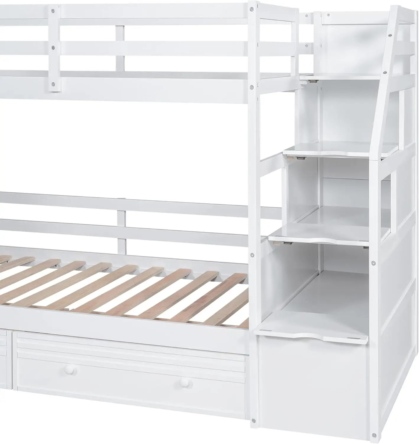 - [Maximized Space] BIADNBZ twin over twin bunk bed with storage drawers and stairs can save plenty of room for you to place other furniture in your bedroom. The two drawers and storage staircase provide ample storage for your everyday items.