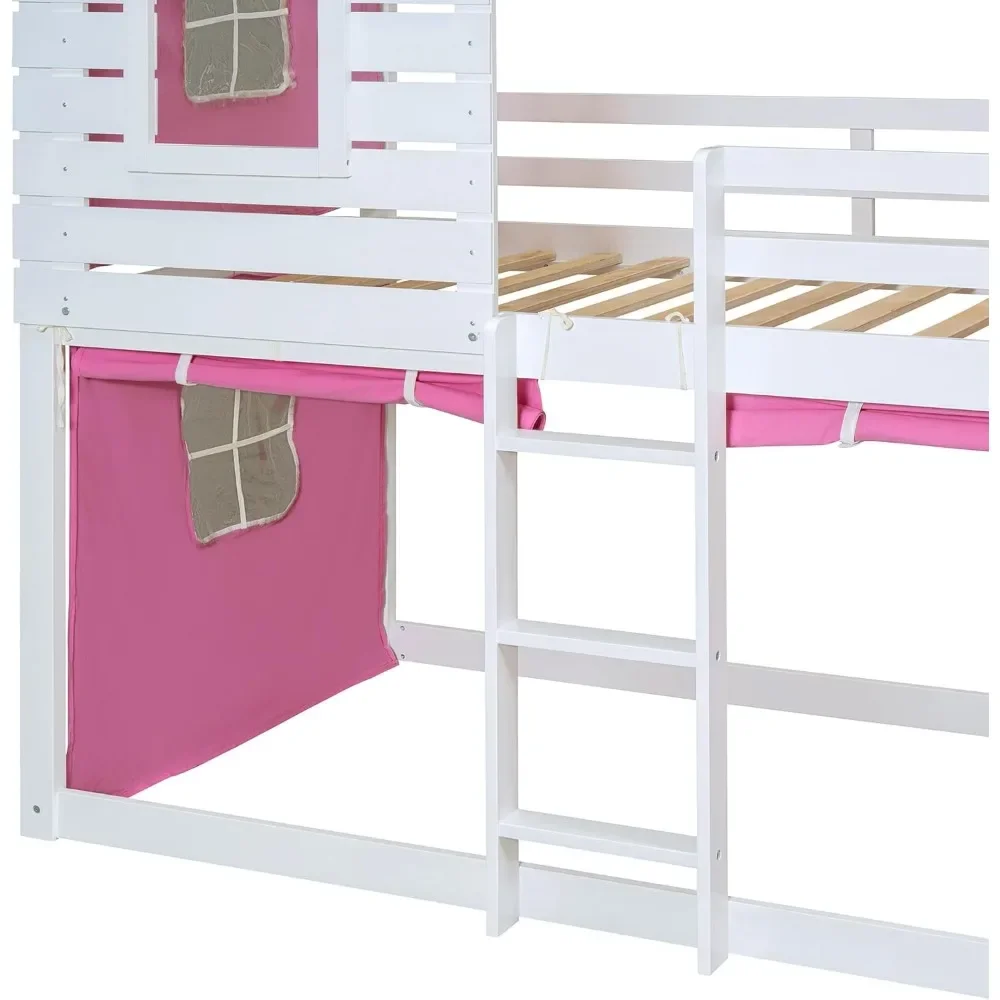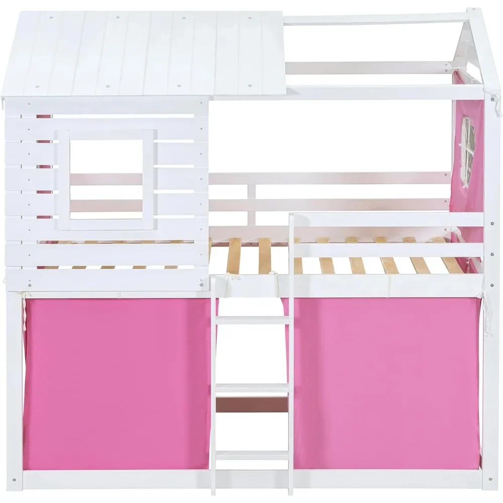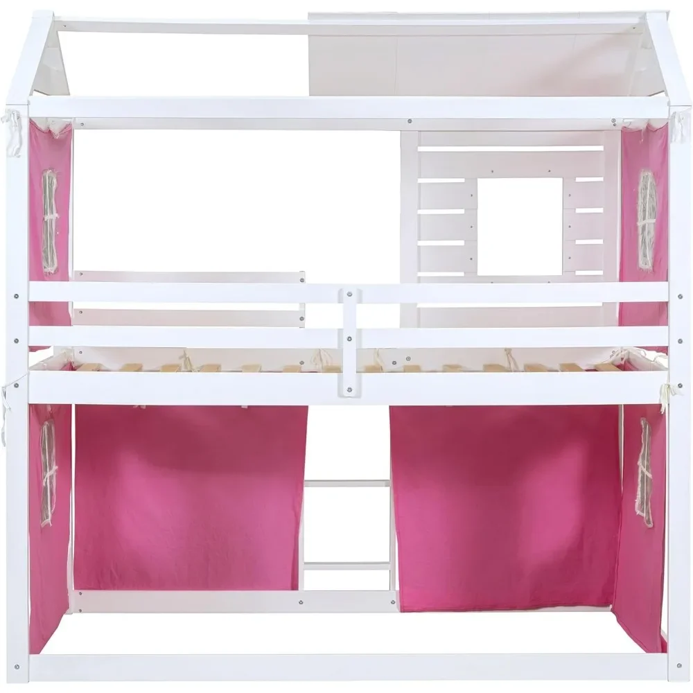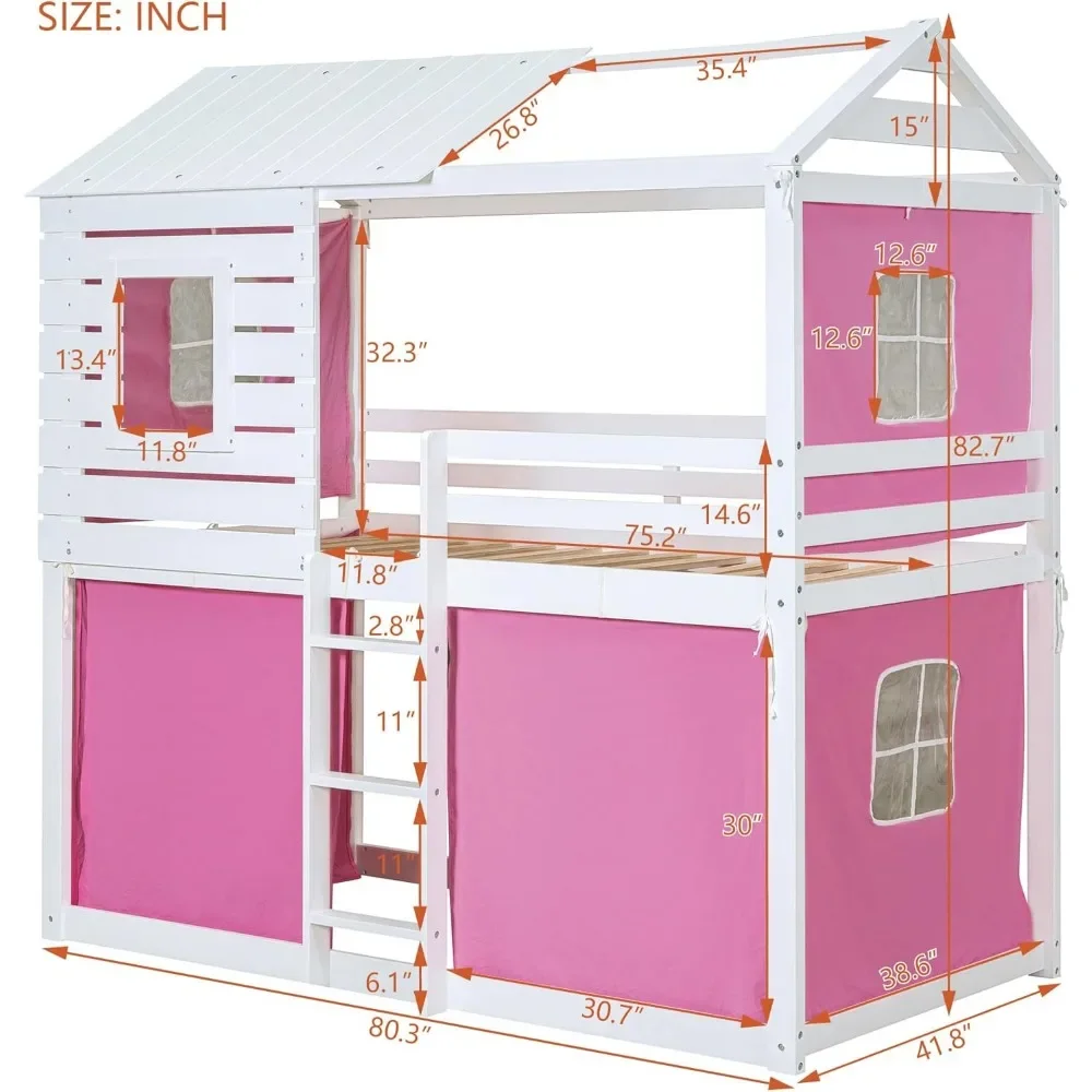 Twin Over Twin Bunk Bed with Tent, Wood Twin Size House Bed Frame, , Pine Wood, MDF House Bunk Bed Pink+White Modern Plywood