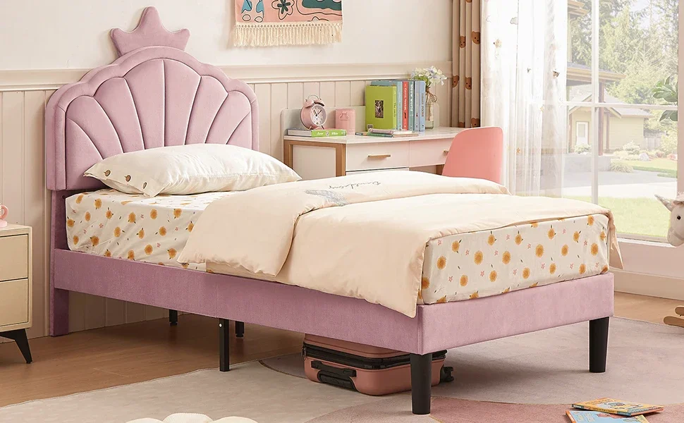 Twin Size Bed Frame Upholstered with Headboard, Strong Platform with Crown for Kids Girls, Wooden Slats Support, No Box S
