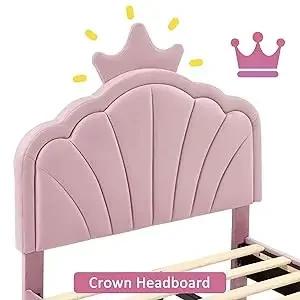 Twin Size Bed Frame Upholstered with Headboard, Strong Platform with Crown for Kids Girls, Wooden Slats Support, No Box S