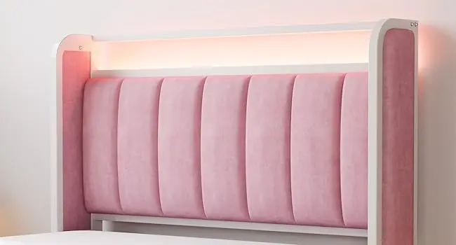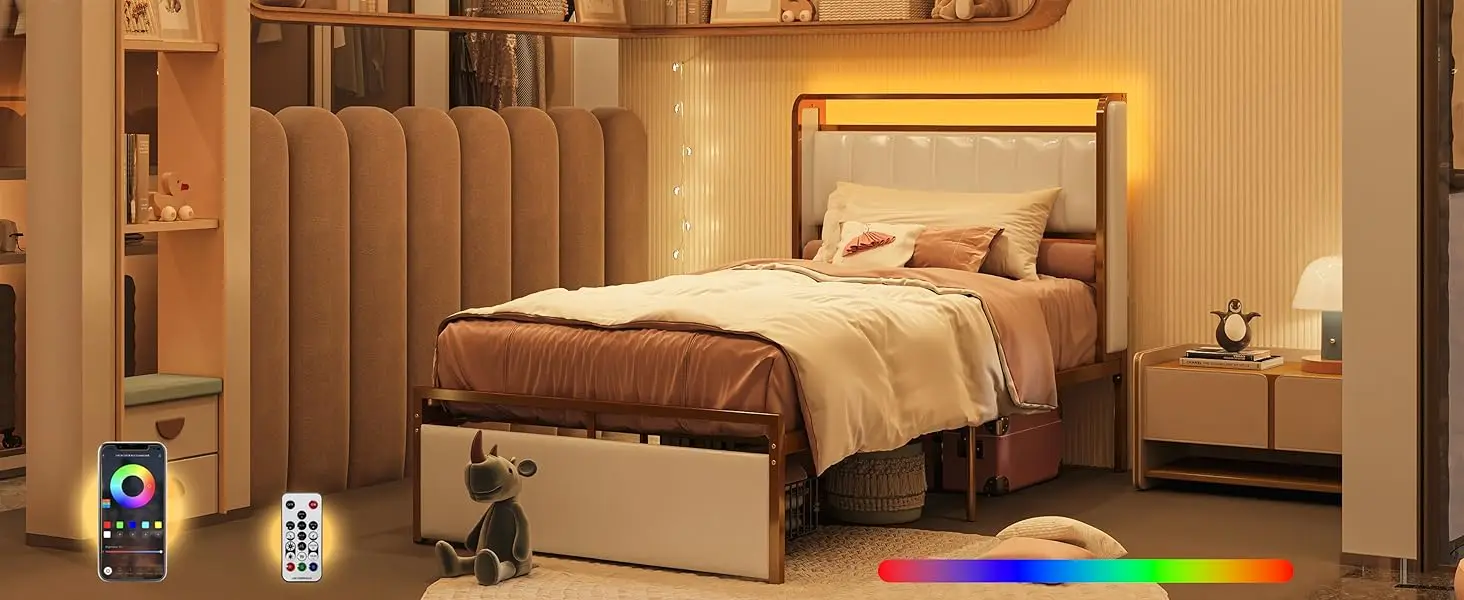 A sturdy upholstered bed with armrests, headboard, drawers, and RGB light provides a comfortable and supportive sleeping surface, convenient storage options, and adjustable ambient lighting for a stylish and functional bedroom.