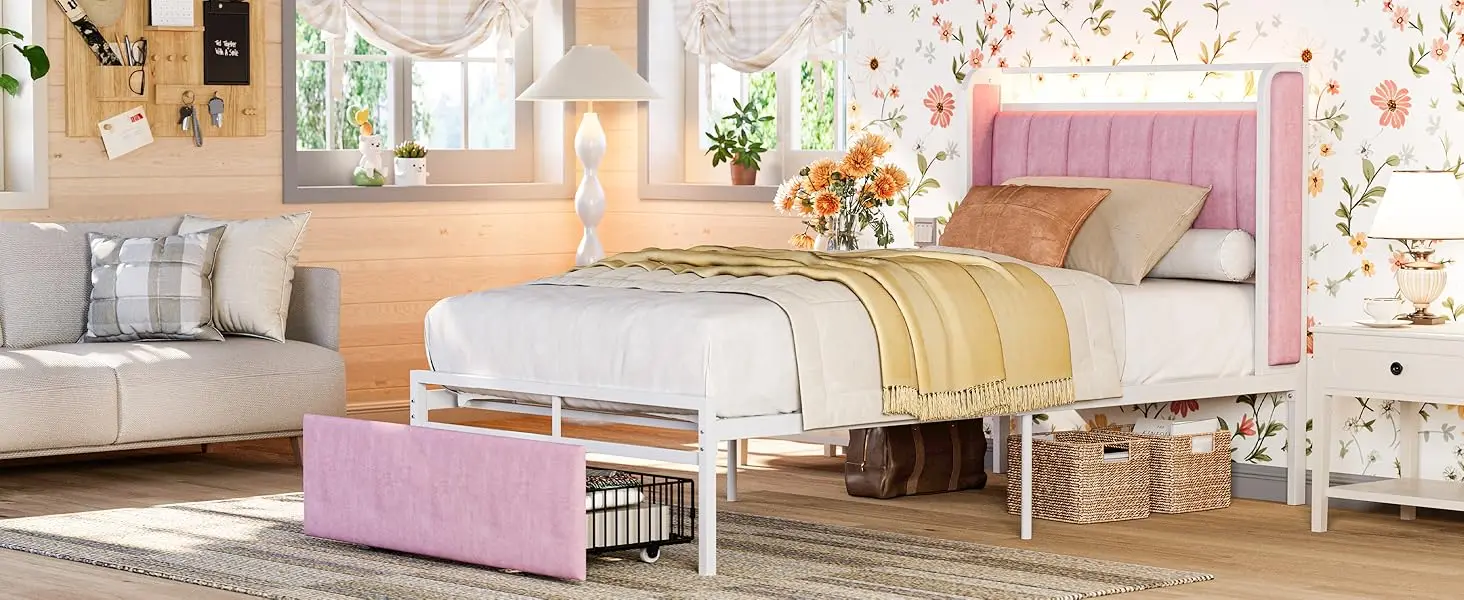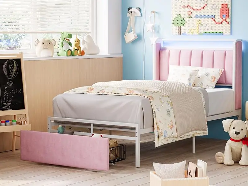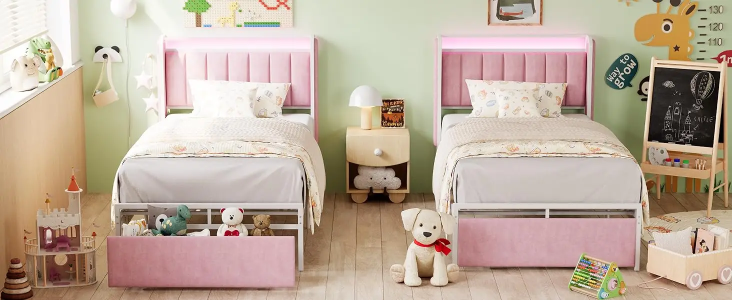 Twin Size Bed Frame with Armrests Headboard & RGB Light, Upholstered Twin Size Bed Platform with Drawers, No Box Spring