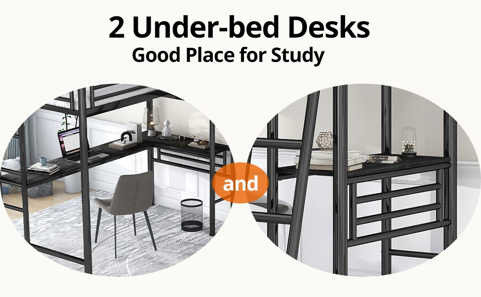 Unlike regular loft beds, our bed consists of 2 twin loft beds with desks, which can accommodate two people to sleep and also provide two desks to meet the different learning or office needs of two children. Very suitable for large families or families with limited space