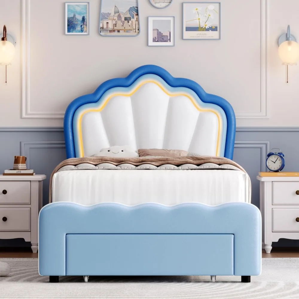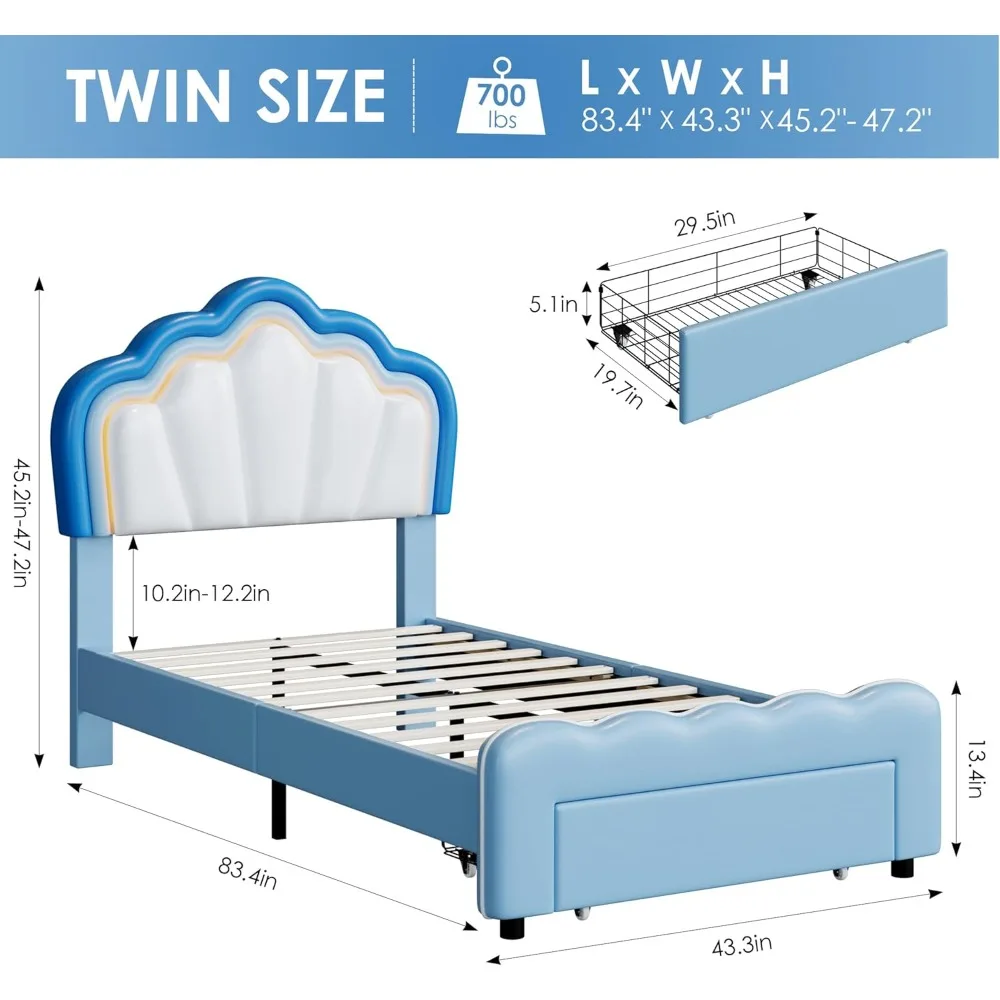 Twin Upholstered Bed Frame with Storage Drawers, Cute Boys Beds with Adjustable Lotus Headboard, Faux Leather Platform Bed Frame
