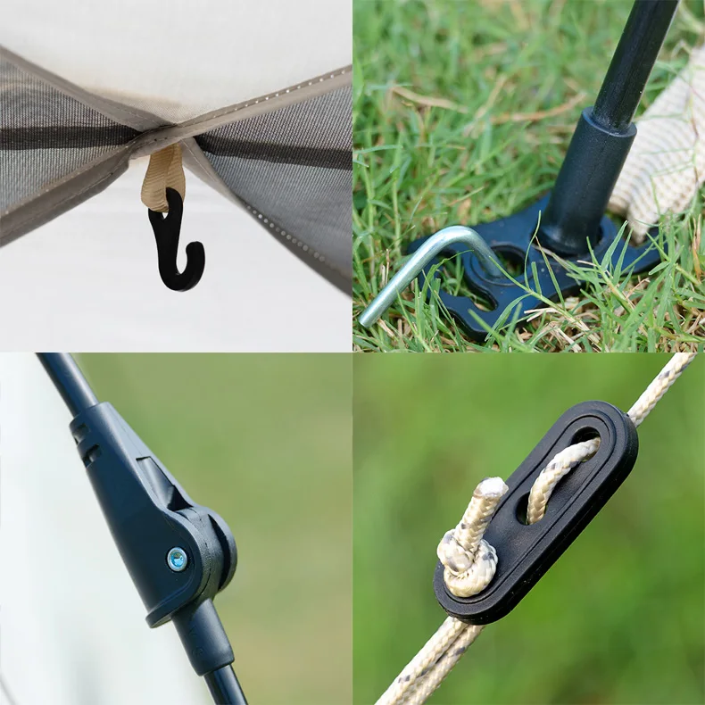 1 accessory storage bag, 1 waterproof top cover, 8 ground nail, 4 wind loops.