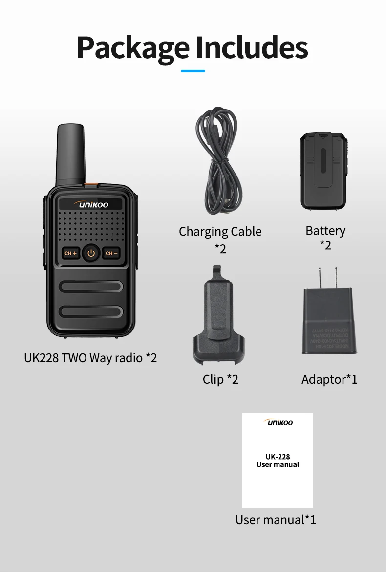 The Unikoo UK228 is a license-free FRS walkie talkie that combines convenience, durability, and versatility in one compact device. With its small size, this portable two-way radio is easy to carry and can be hung on your collar with the provided belt clip. It features 16 memory channels, making it suitable for a variety of communication needs.