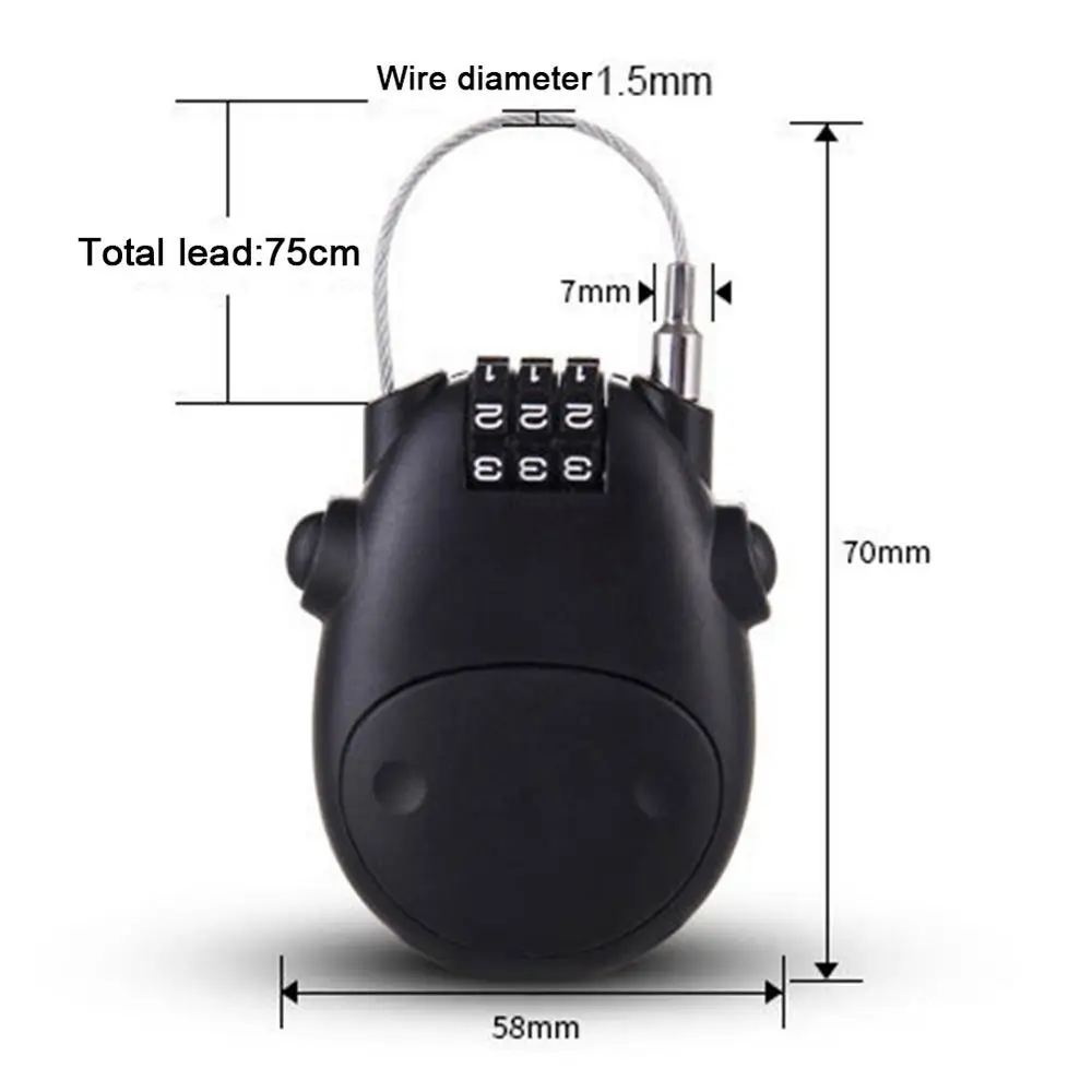 1.Telescopic Wire Rope Steel Cable Code Lock Suitcase Car Sled Motorcycle Helmet Password Lock Helmet Password Lock Material: alloy plastic Color: picture color Installation: lossless installation Product size: about 70x50mm The total length of the wire is about: 75cm