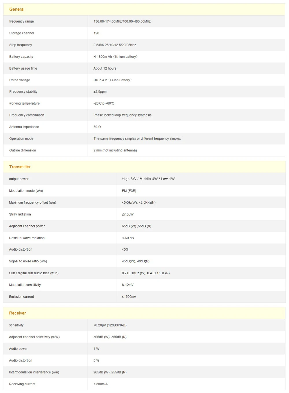 *Dual-band handheld transceiver with display function menu on the display LED *Â Commercial FM radio receiver (65MHz-108MHz) * Built-in LED flashlight * DTMF encoded * Built-in RX CTCSS/DCS scan * VOX function * Alarm function * Broadband / narrowband selectable * Function beep on the keyboard * Dual watch/dual Reception * Crossband reception/transmission * Function OFFSET * Tone end of transmission * Battery saving function * Programmable by PC * Built-in key lock |