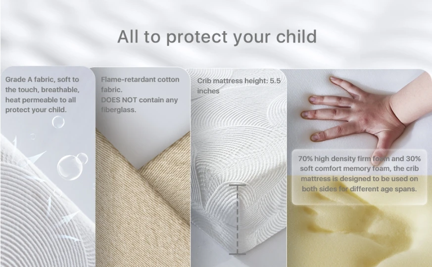 SAFETY: crib mattress uses the latest and safest technology to protect your child from fire, we use a flame-retardant cotton lining, and as an extra layer of protection the mattress DOES NOT CONTAIN any fiberglass, add to that, our mattress passed all flammability tests (16 CFR 1632 /1633).