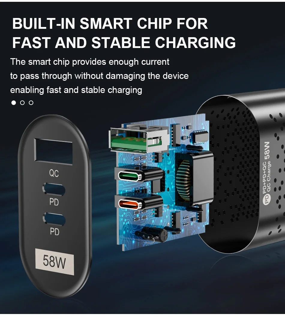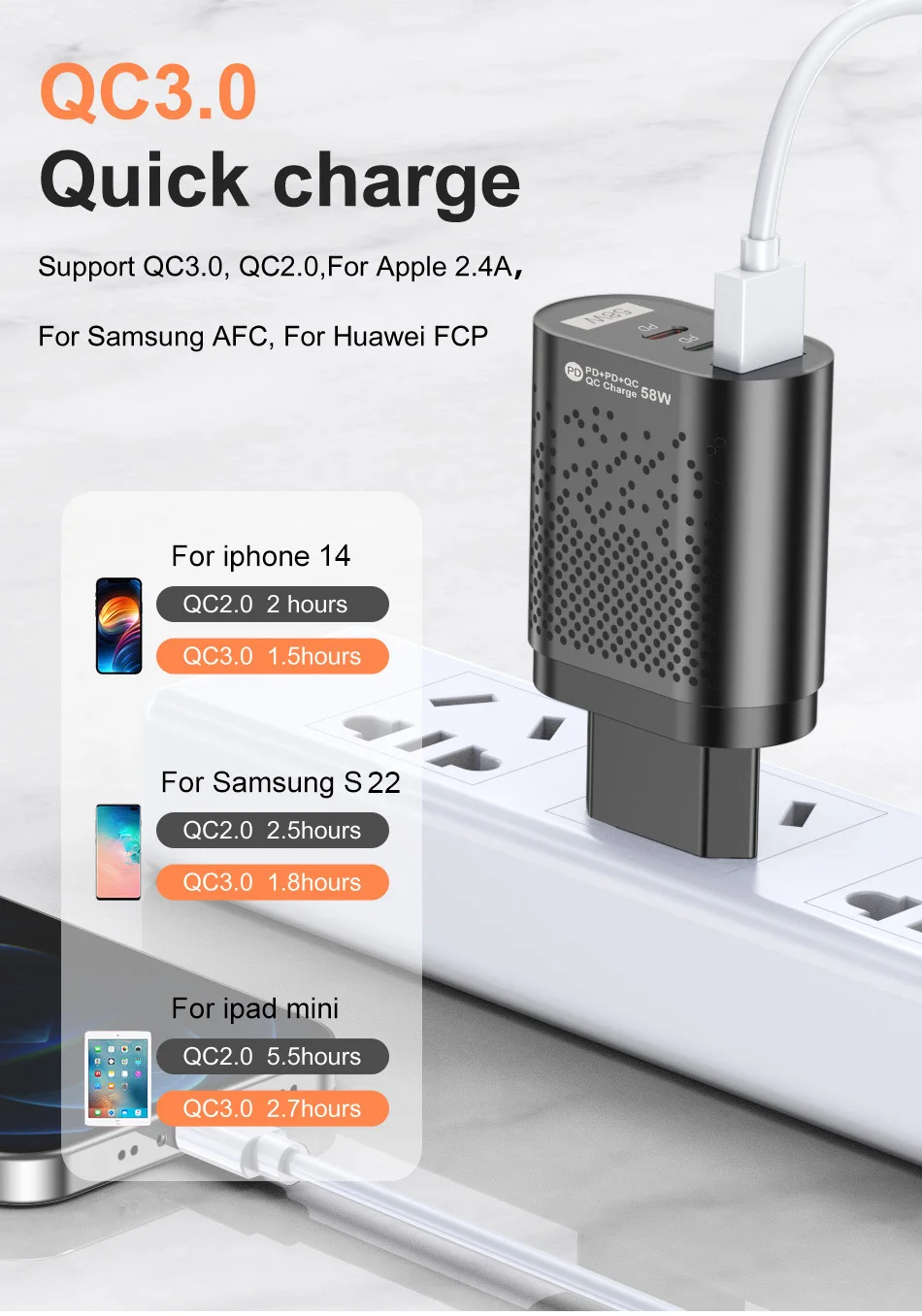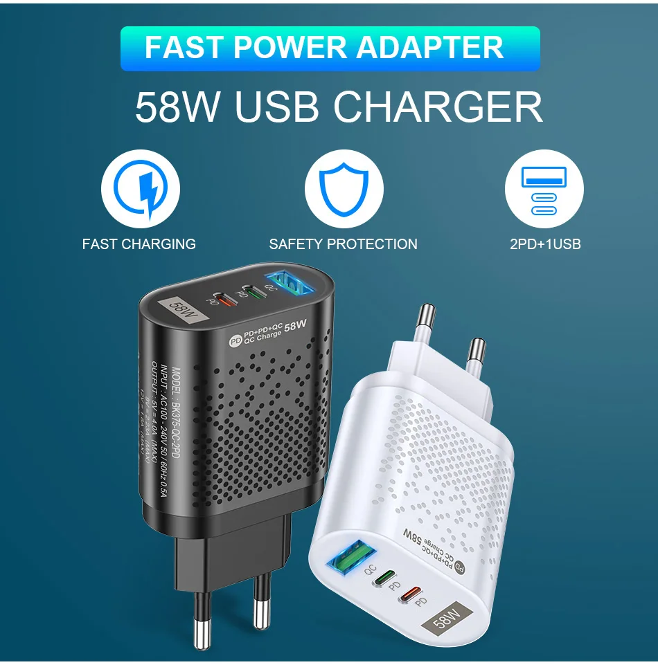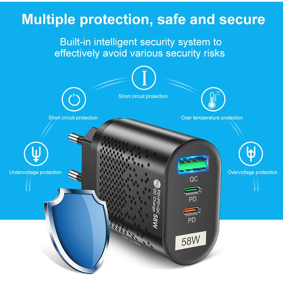 USLION 58W USB C Charger Travel Fast Charging Charger Tablet Laptop PD Quick Charge 3.0 Wall Phone Adapter For iPhone 15 Xiaomi