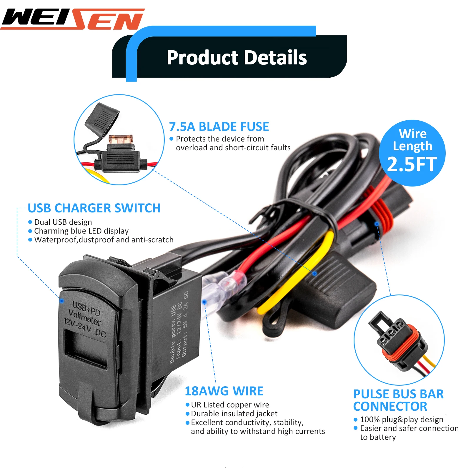 UTV Dual USB Tpye C Rocker Switch Charger/Outlet 12v for All Polaris with The Pulse Bus Bar RZR Ranger General XP 1000 Trail