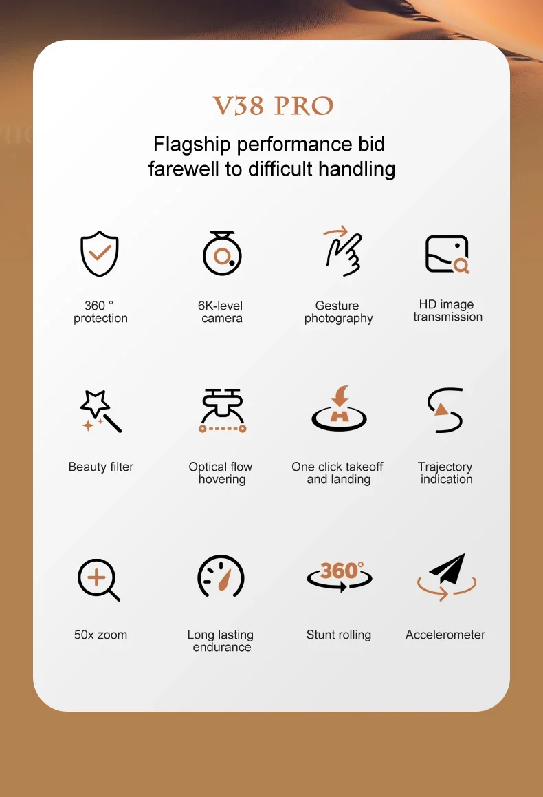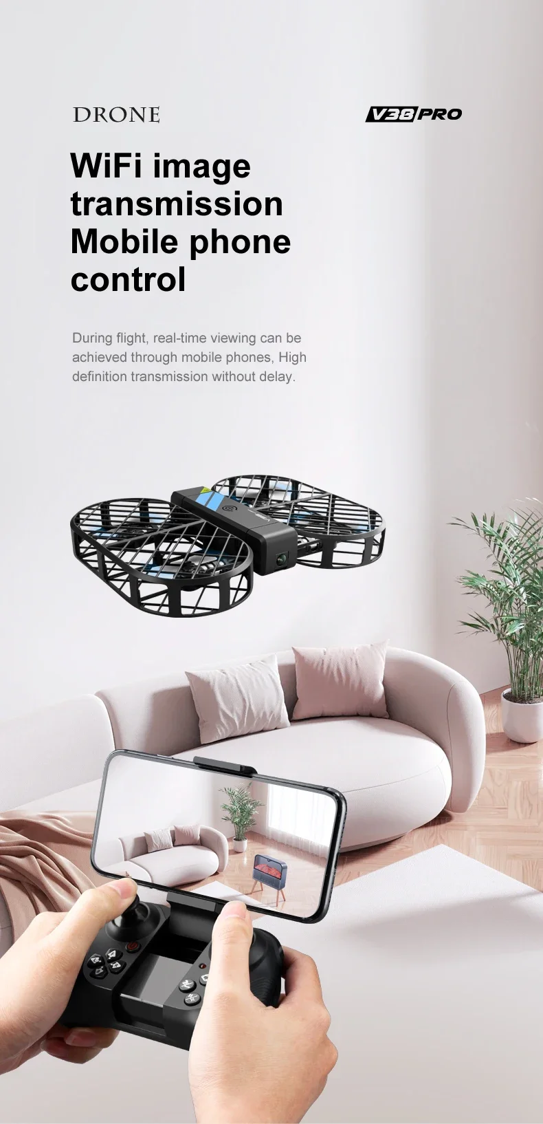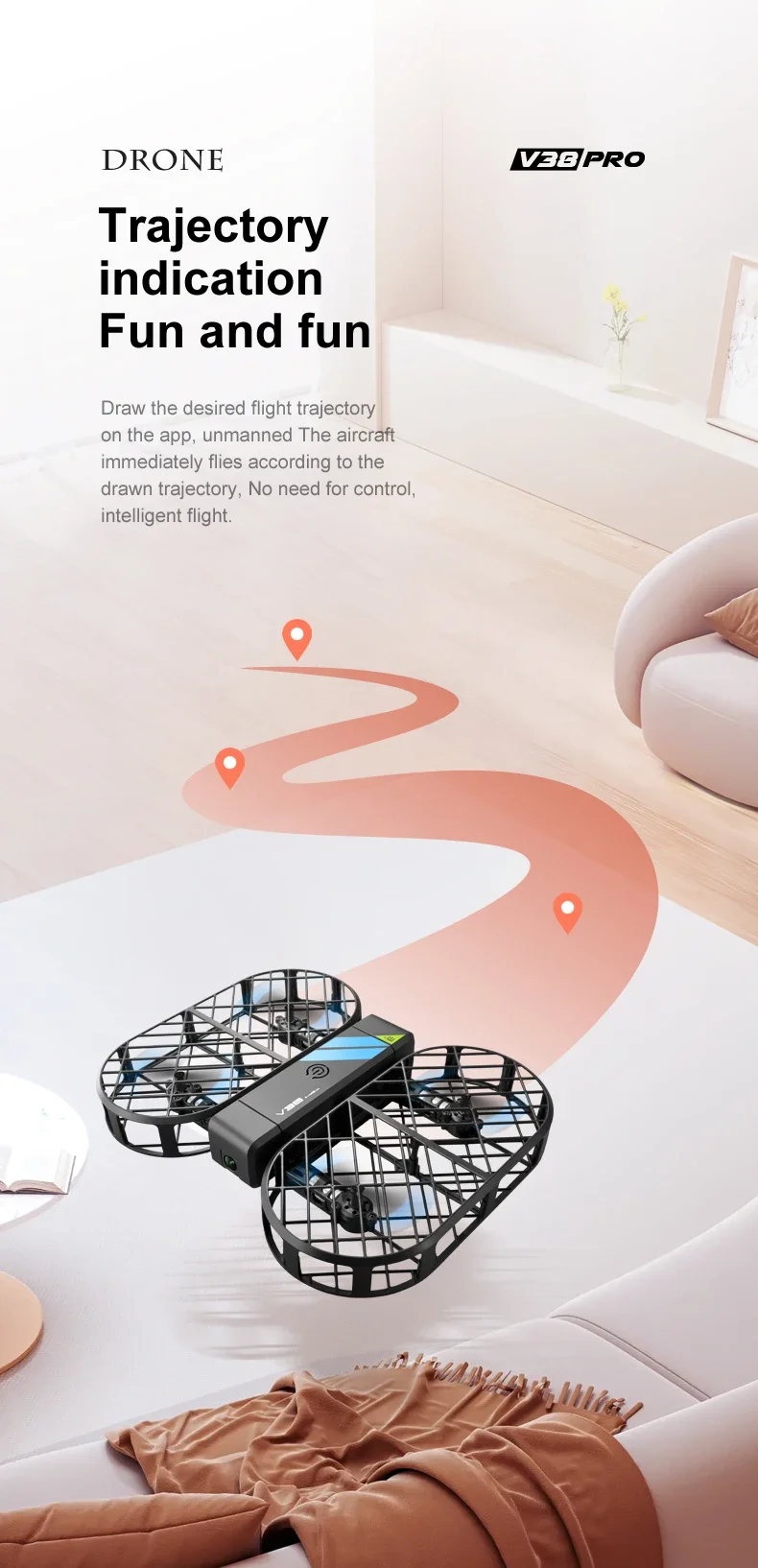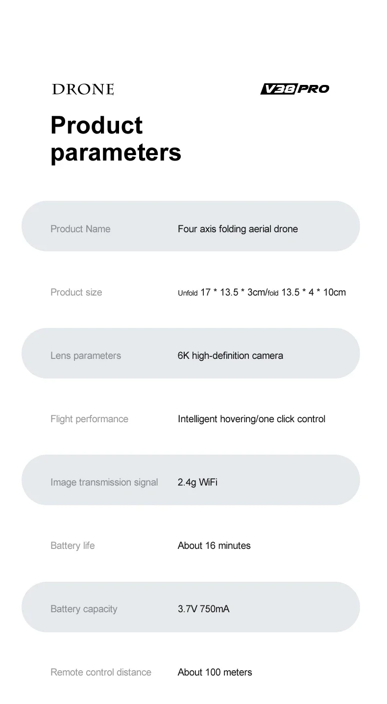 [Function Description:] 1. Rechargeable lithium battery; 2. Low battery light prompt; 3. Mobile phone control; 4. Ascending and descending/moving forward and backward/turning left and right/turning left and right; 5. Fast and slow switching; 6. Headless mode; 7. 360 degree rolling; 8. One click start/landing 9. Gravity mode/Trajectory flight