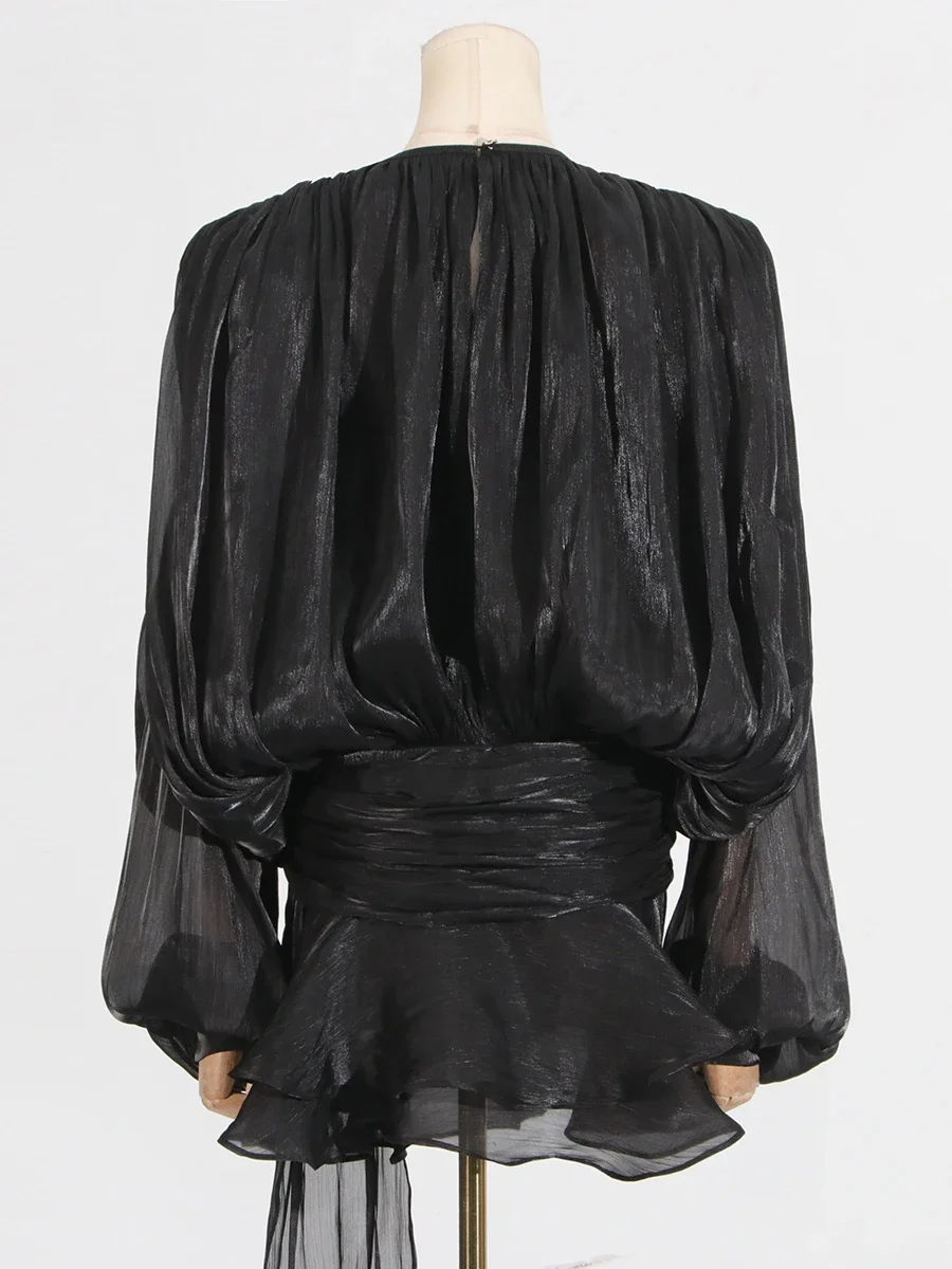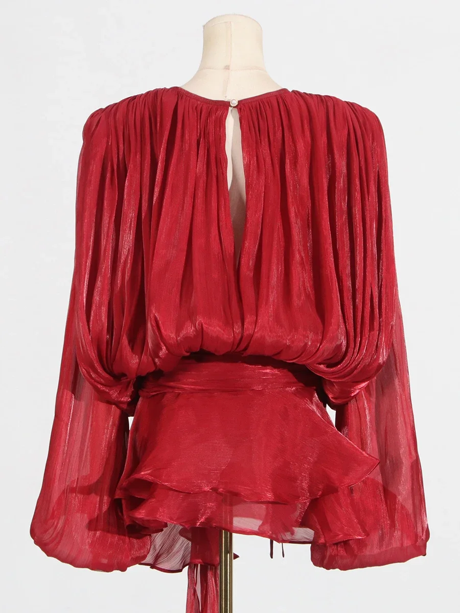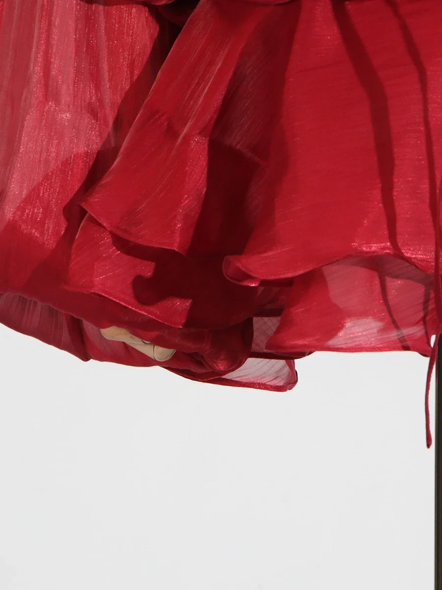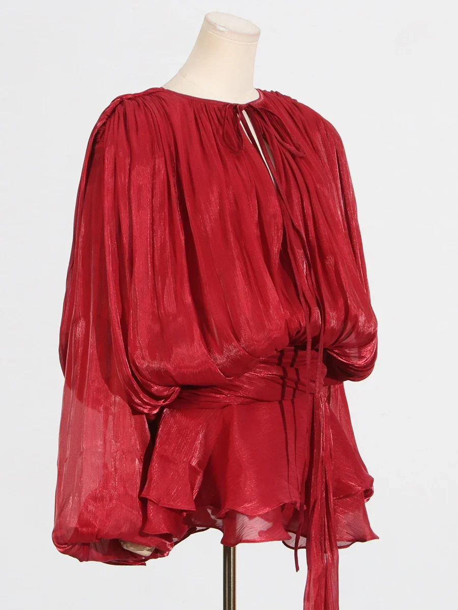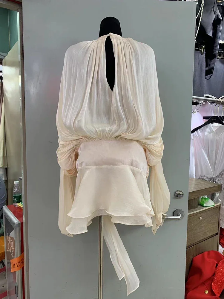 VGH Loos Spliced Lace Up Hollow Out Dresses For Women Round Neck Lantern Sleeve High Waist Minimalist Ruffles Short Dress Female