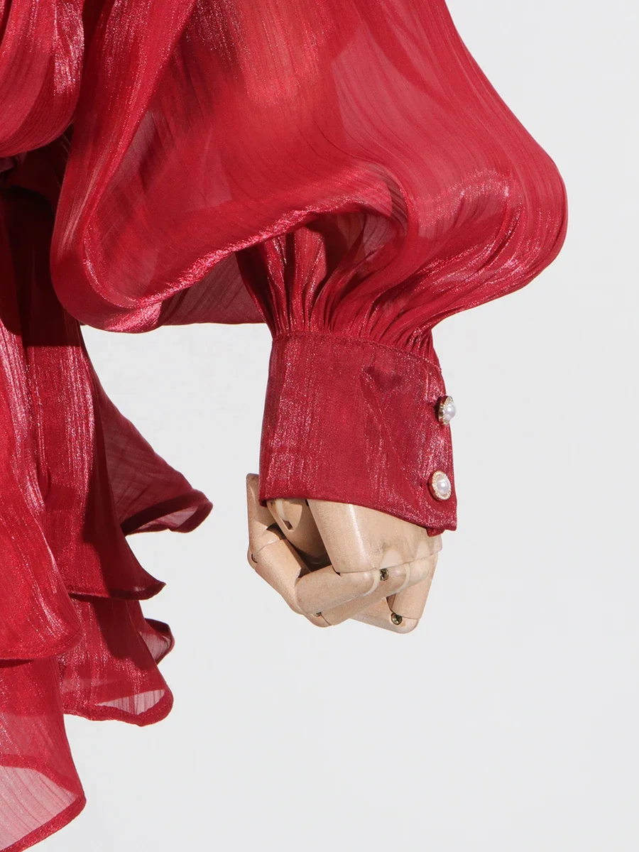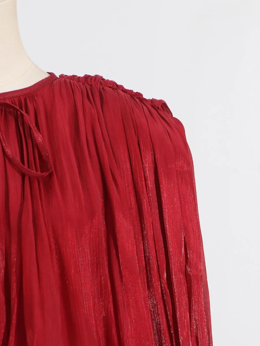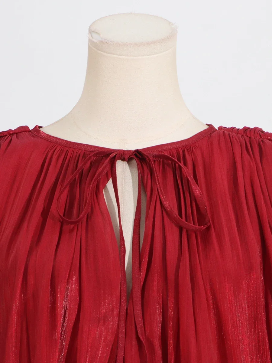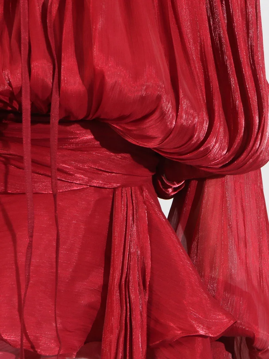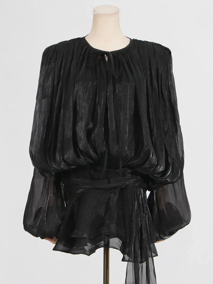 VGH Loos Spliced Lace Up Hollow Out Dresses For Women Round Neck Lantern Sleeve High Waist Minimalist Ruffles Short Dress Female