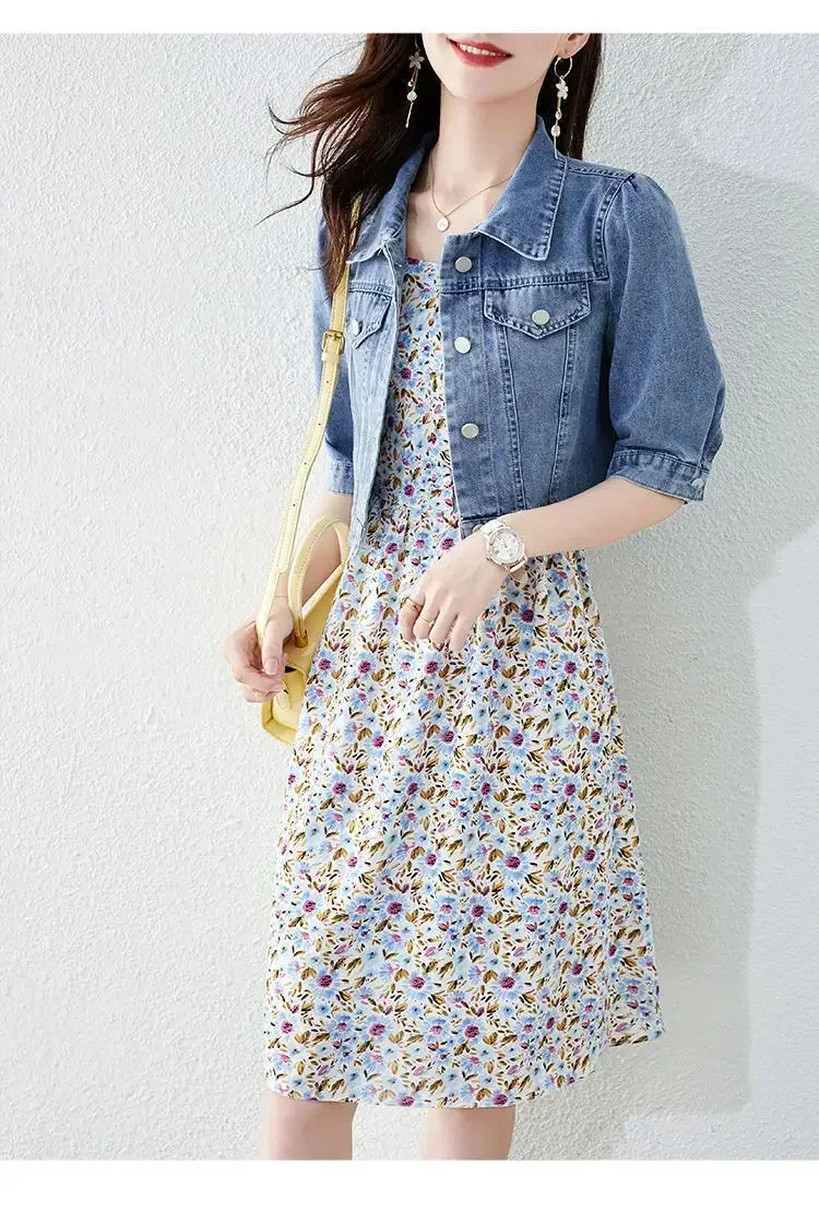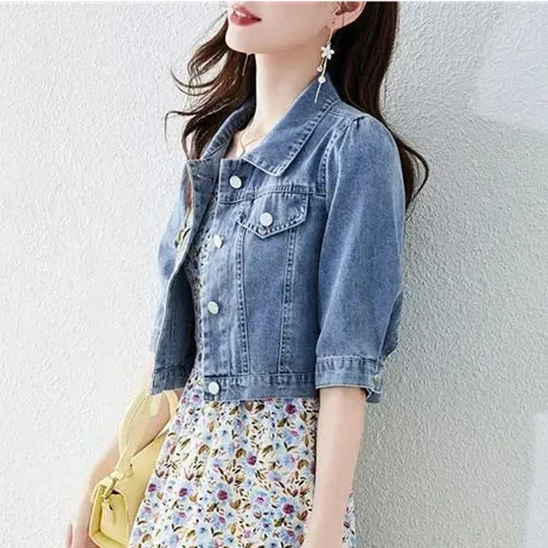 Vintage Crops Trendy Turn Down Collar Jackets Women Basic Solid Outwear Half Sleeve Denim Fit Harajuku Street Denim Jacket Women