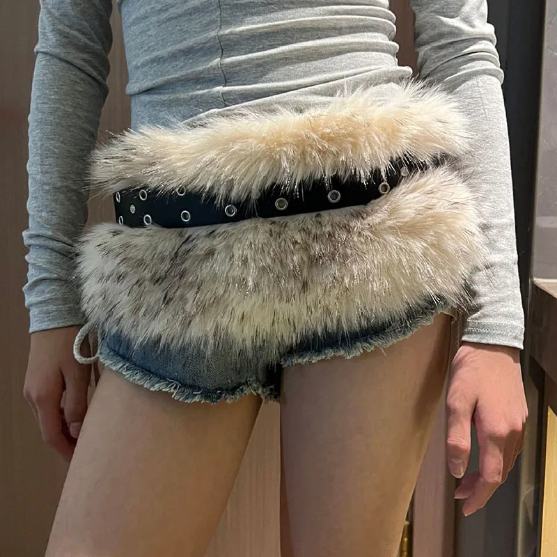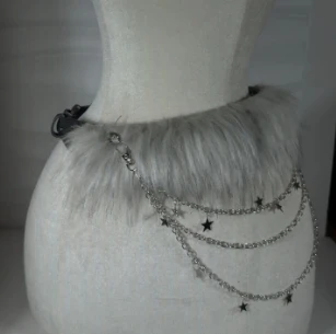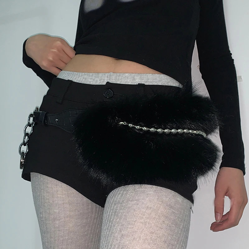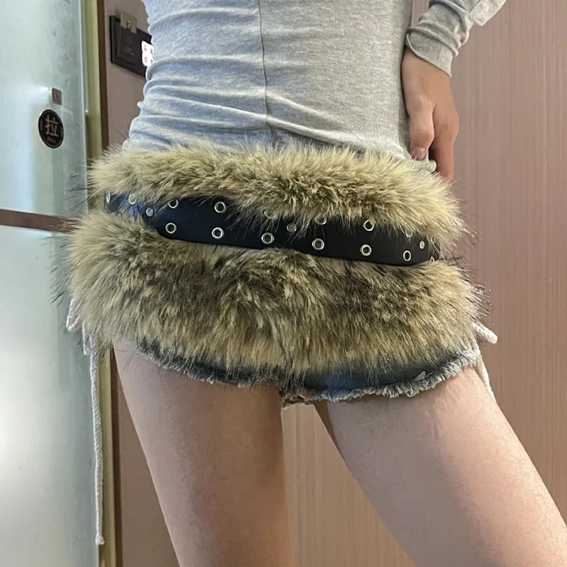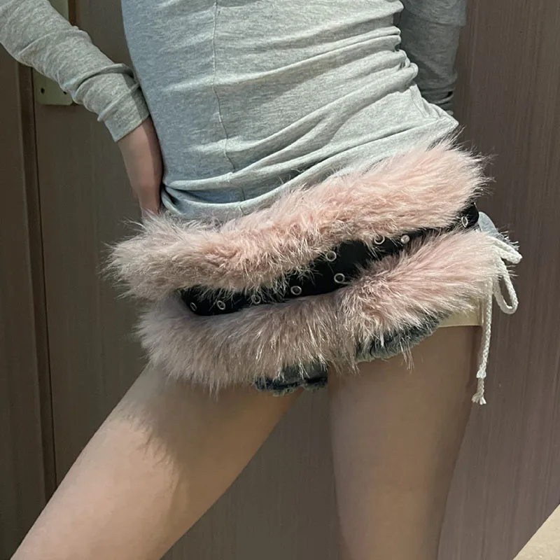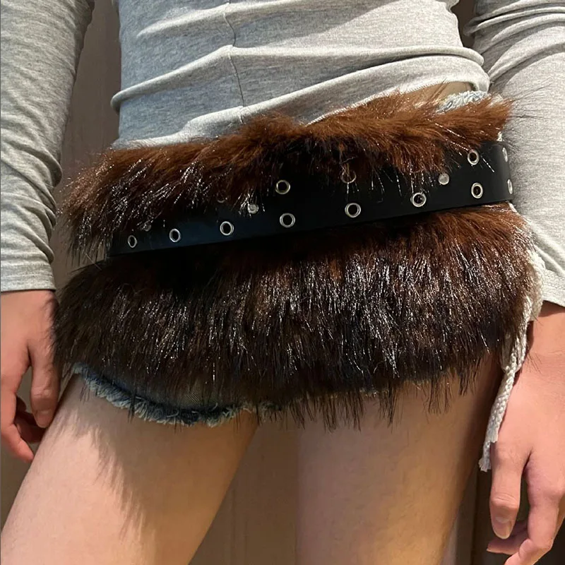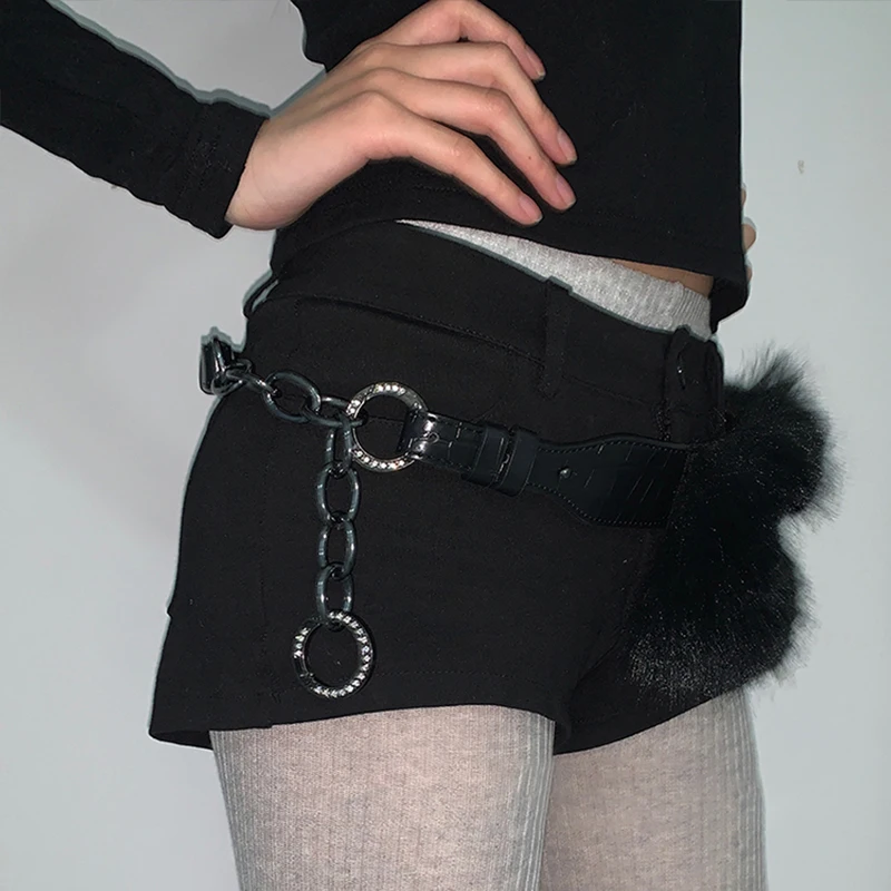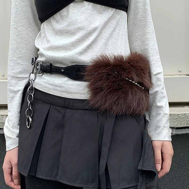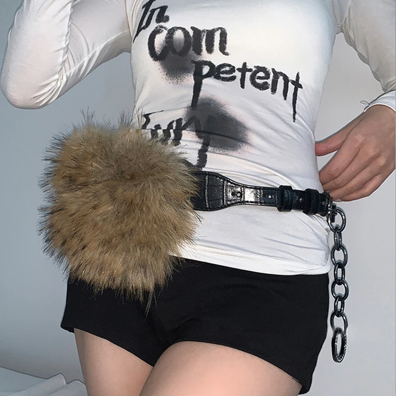 Vintage Faux Fur Belts Y2K Metal Bead Chain Plush Waist Chain Furry Fur Sexy Cowgirl Waistband Punk Belt Jeans for Night Club