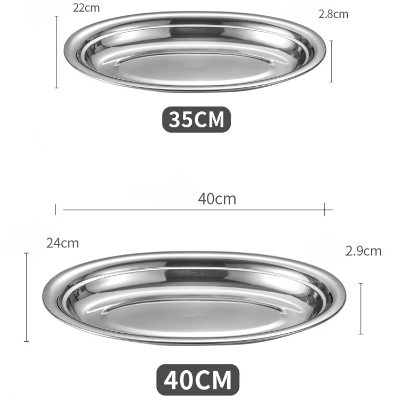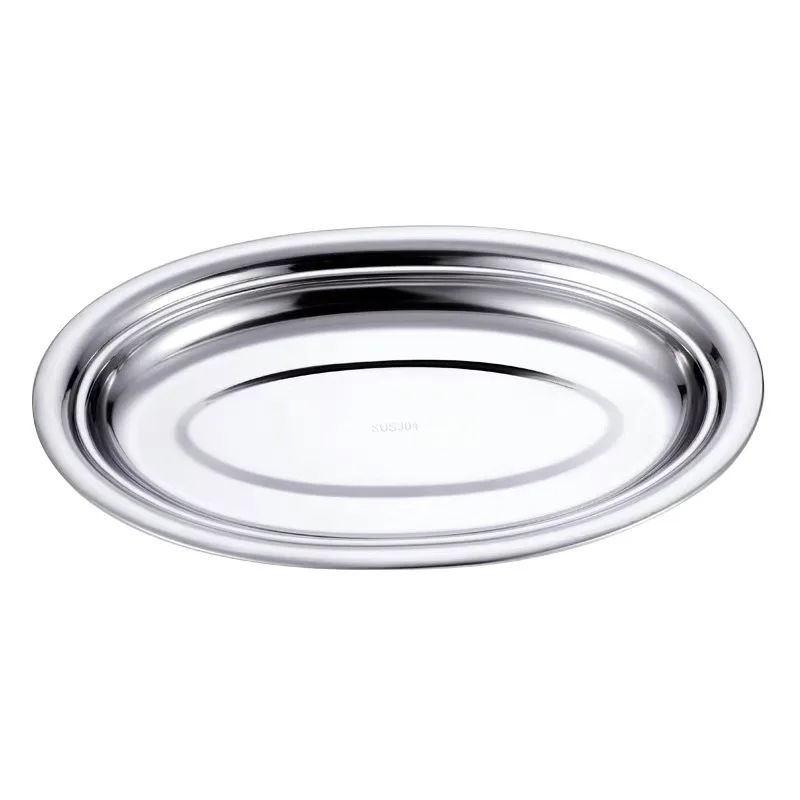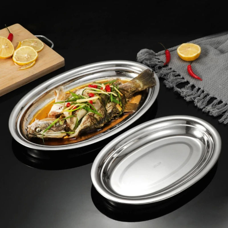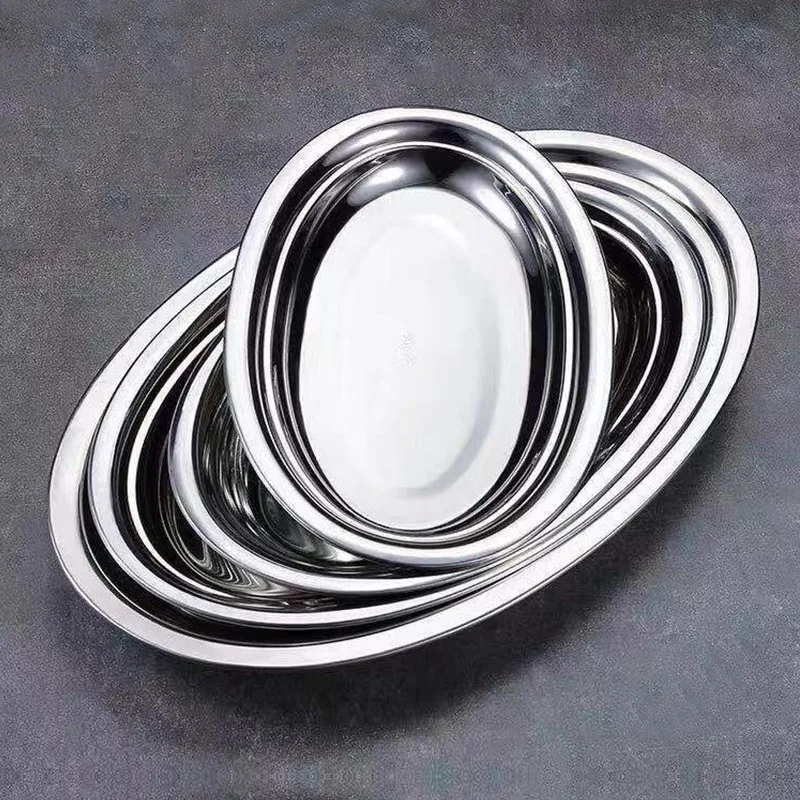 Vintage Oval Fish Plates 304 Stainless Steel Household Silver Dinner Steamed Shallow Dishes Plate Dessert Tray Kitchen Tableware
