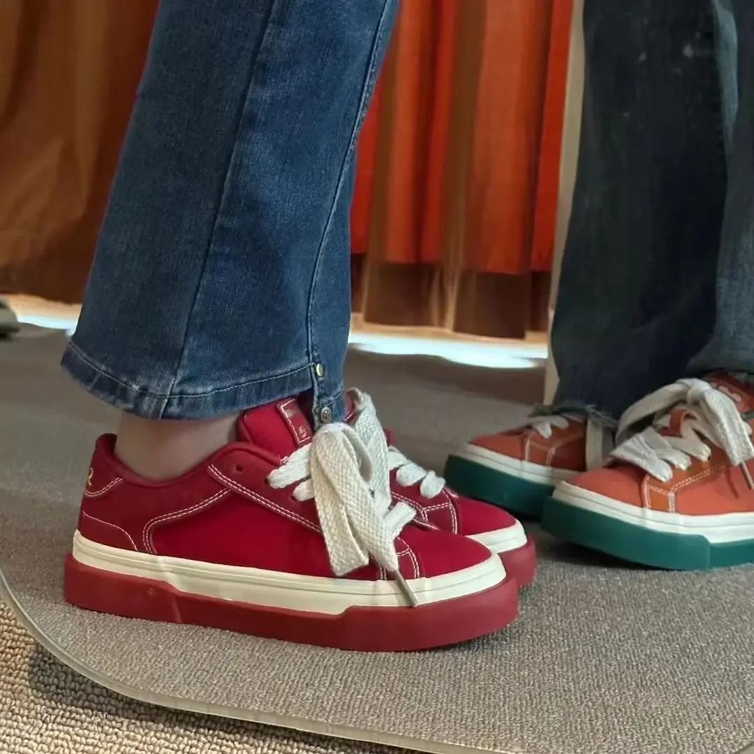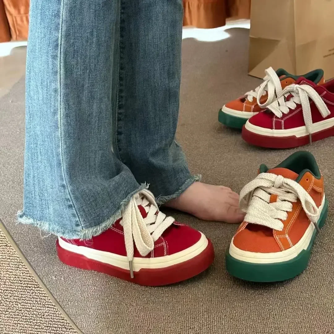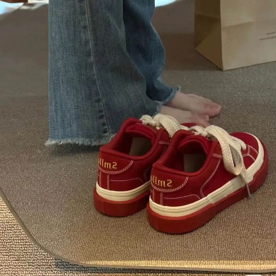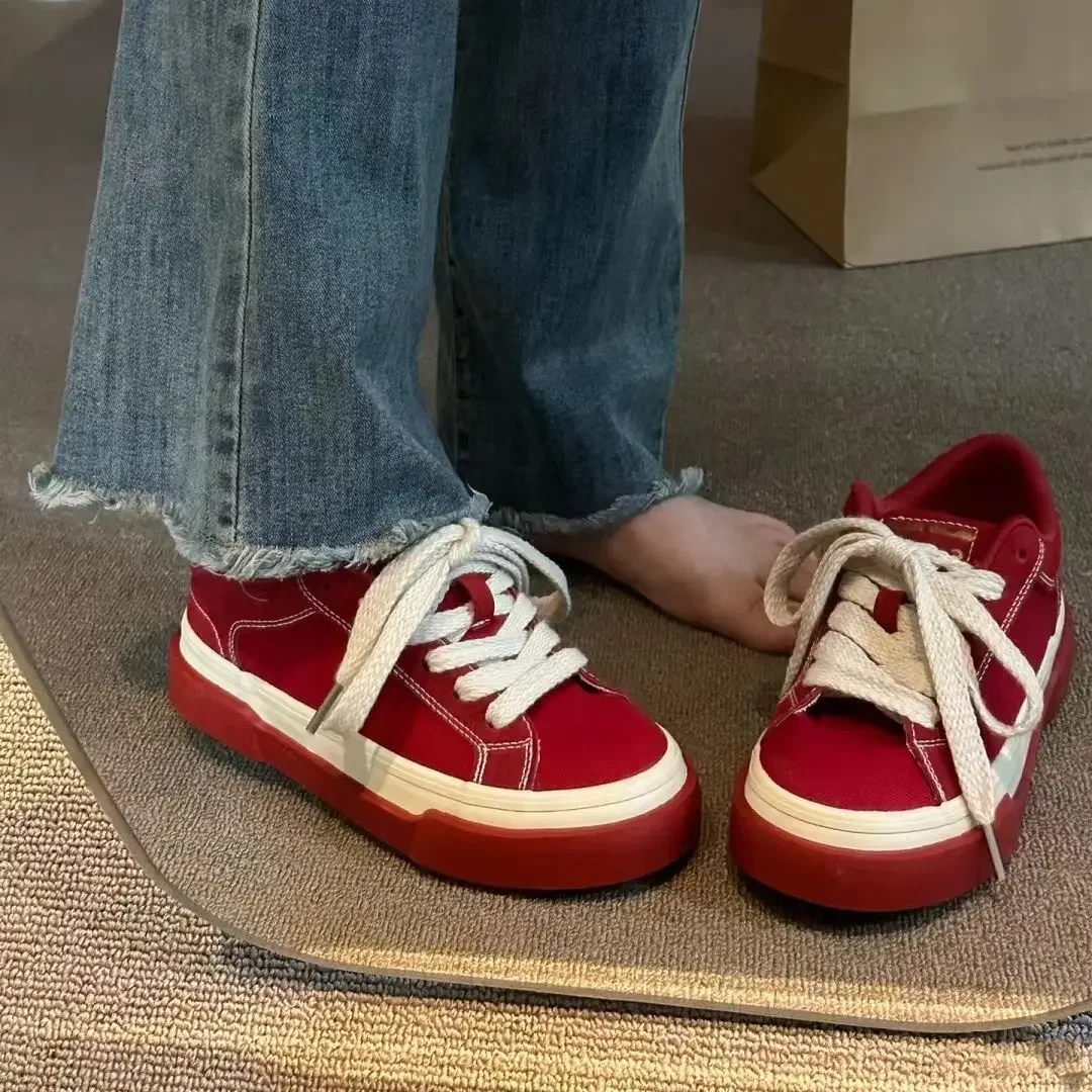 Vintage Red Canvas Low-top Women Sneakers Casual Letter Embroidery Skateboard Shoes Students Flat 2024 Fashion