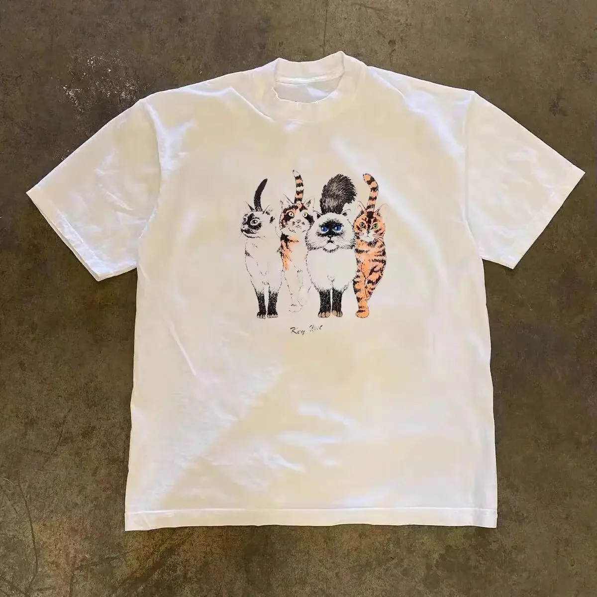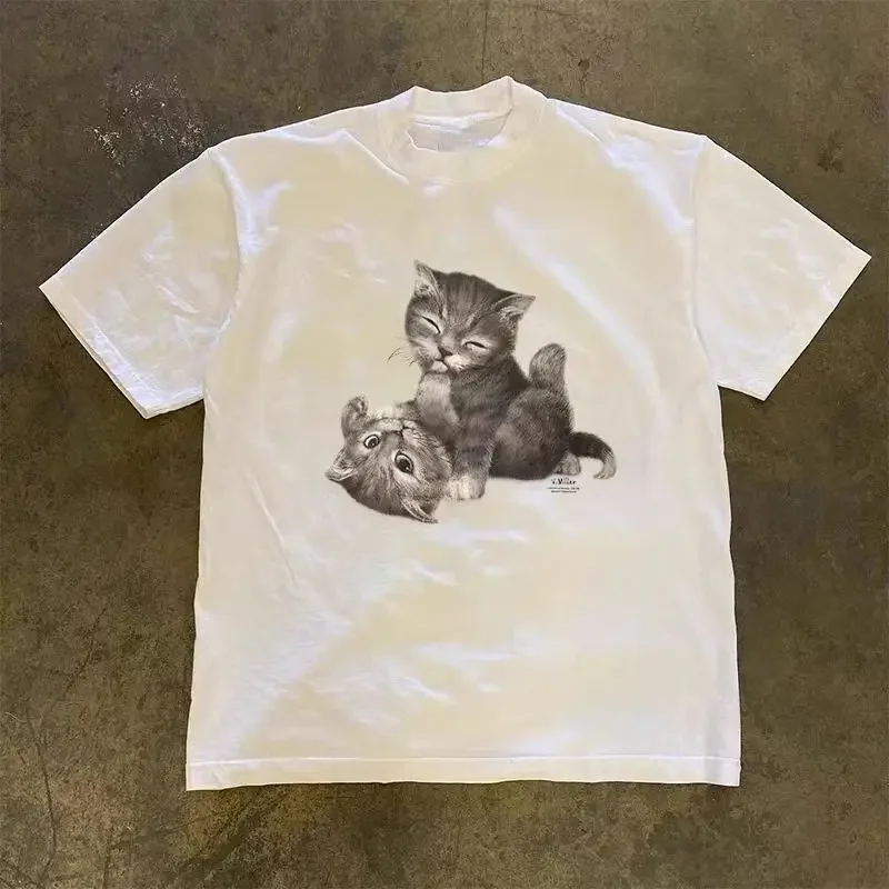 Vintage Summer Hip Hop Harajuku Vintage Cat Print Plus Size T-Shirt Street Short Sleeve Casual Women T-Shirt Y2k Punk Clothing