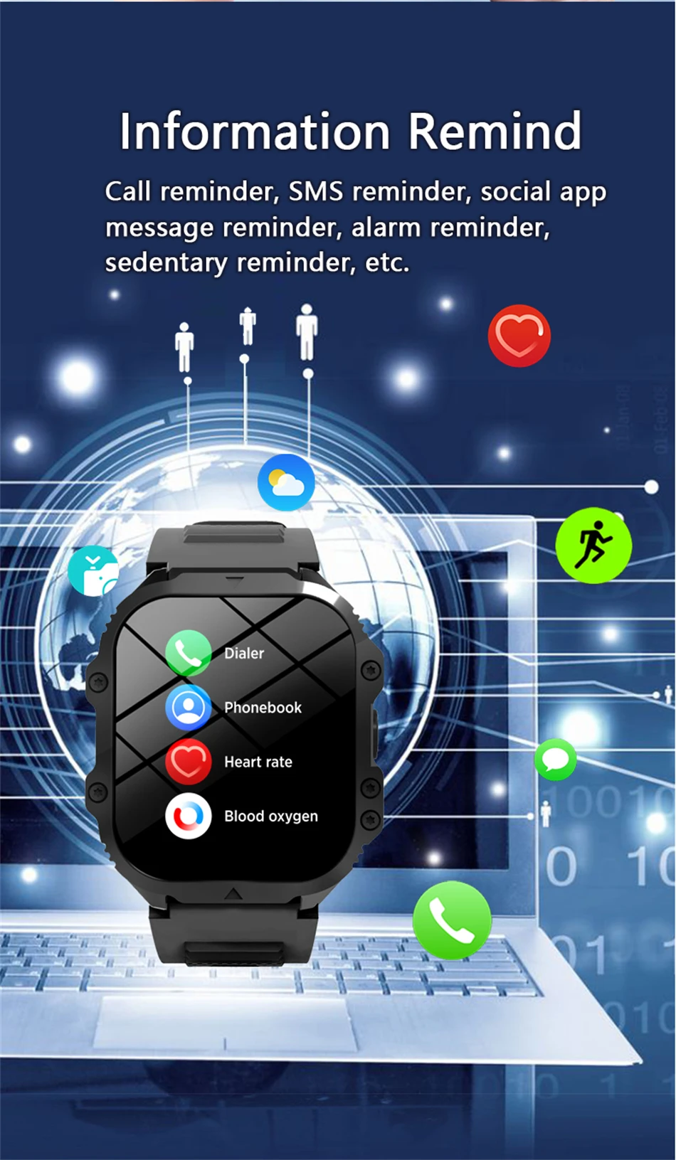 Three rings of health、Heart Rate/Blood Pressure/Oxygen 、BT call、BT Music、ECG monitoring、Sleep monitoring、call reminder、SMS Alerts、Social APP Message Reminder、Alarm clock reminder、A sedentary reminder、sport、Turn the wrist and shine the screen、Looking for bracelets、Looking for Phones、Remote Photography、Do Not Disturb、Dial customization、Flight mode, common contacts, Siri, music control, weather,WeChat、QQ、Facebook、Twitter、Line、Whatsapp、Instagram, etc