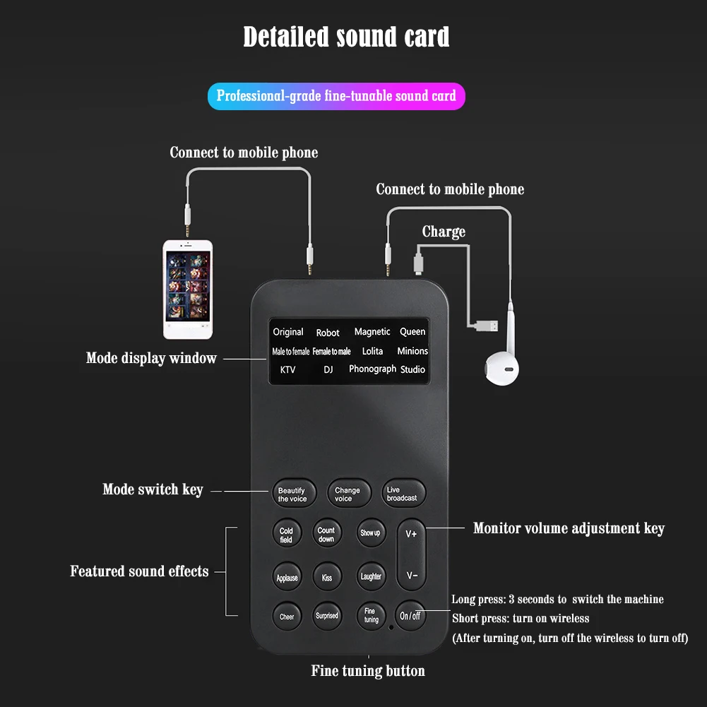 Born to change voices for entertainment. Fine-tuning bel Canto sound card, built-in 1048 DSP sound card chip, 12 modes, 8 kinds of special effects sound, 1 key bel canto sound, live karaoke device, real-time monitoring, Bluetooth-compatible accompaniment, intelligent noise reduction, plug and play, widely compatible, compact and portable