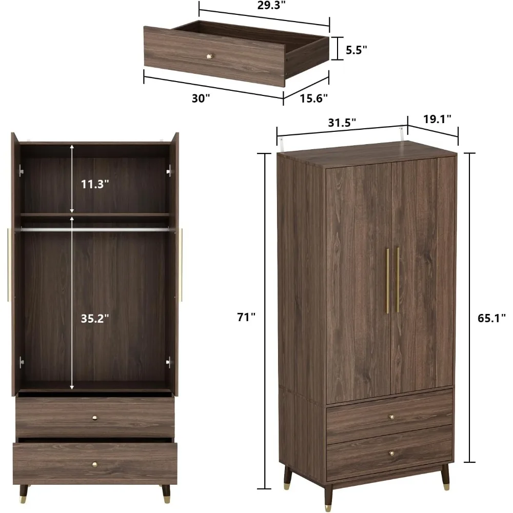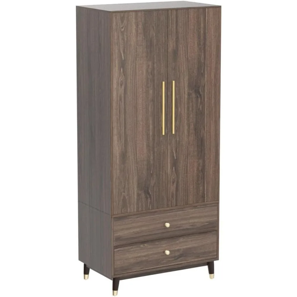 Wardrobe Armoire Closet with 2 Doors,Wardrobe Cabinet with 2 Drawers &Hanging Rod,Bedroom Armoire Clothes Organizer with Handles