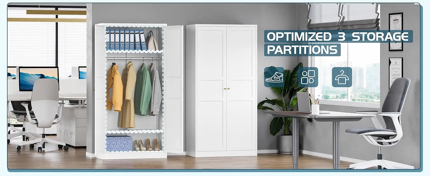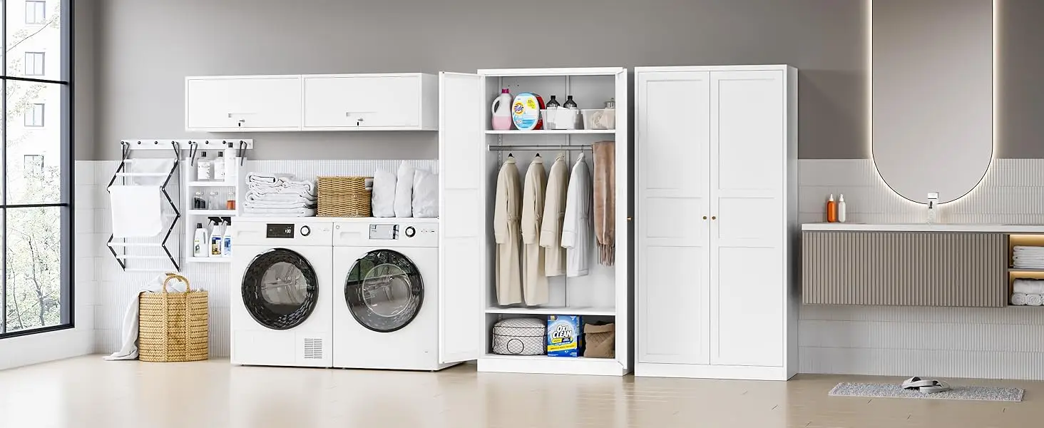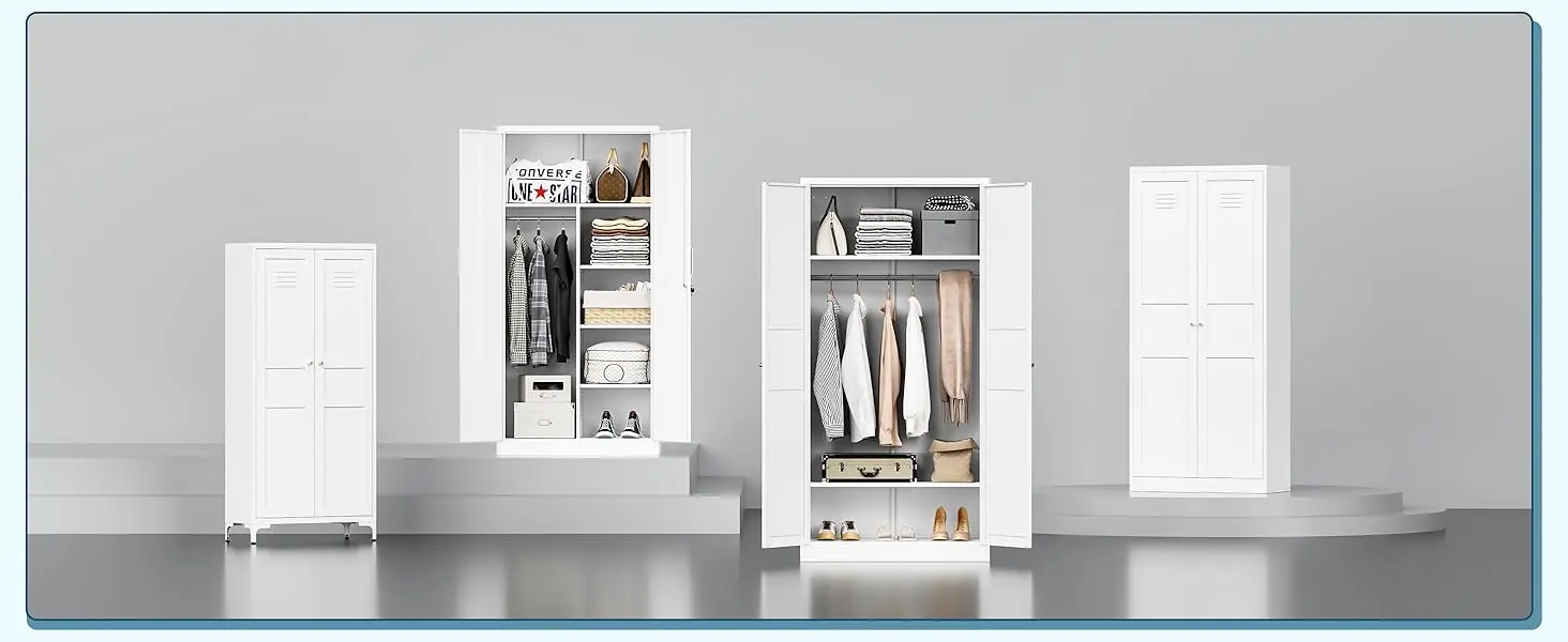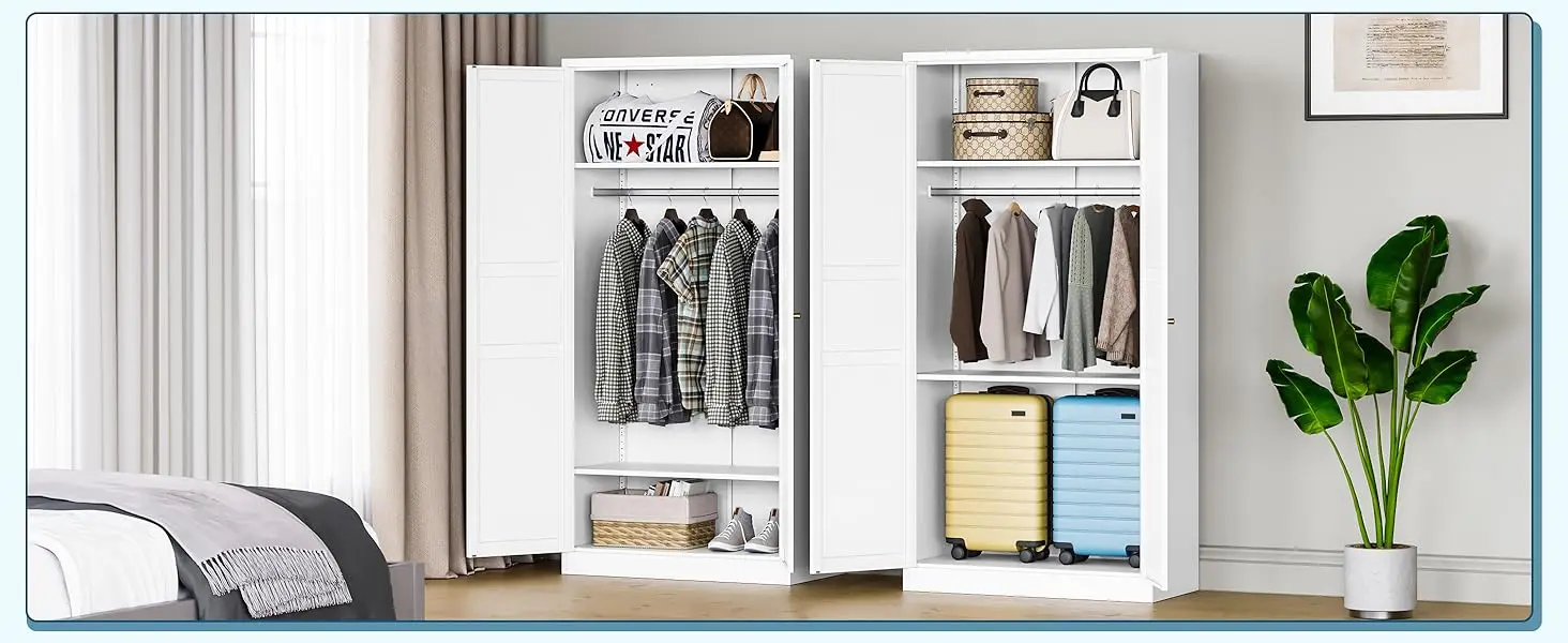 Wardrobe Closet with 2 Doors, 72″ Metal Clothing Storage Cabinets with Hanging Rod, Bedroom Laundry Room and Off