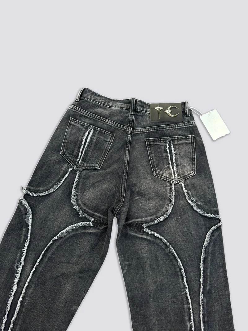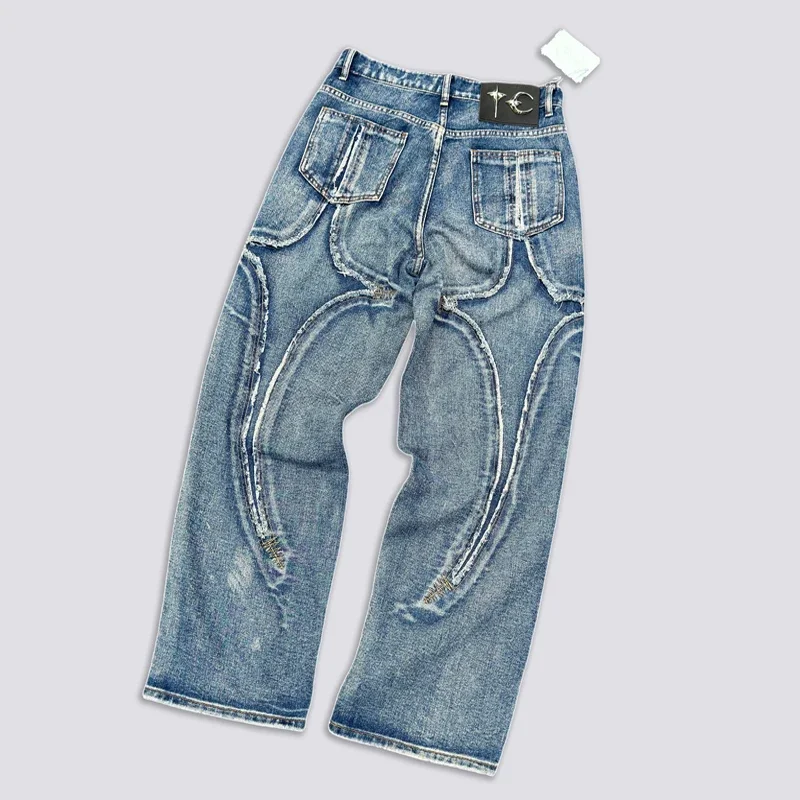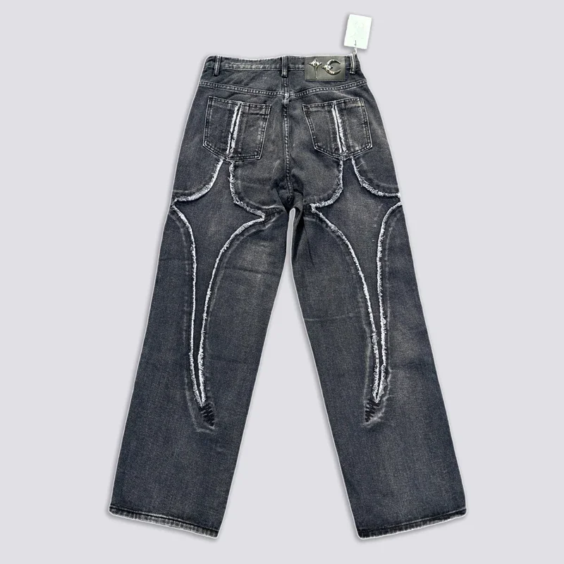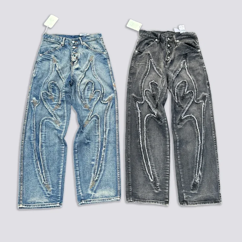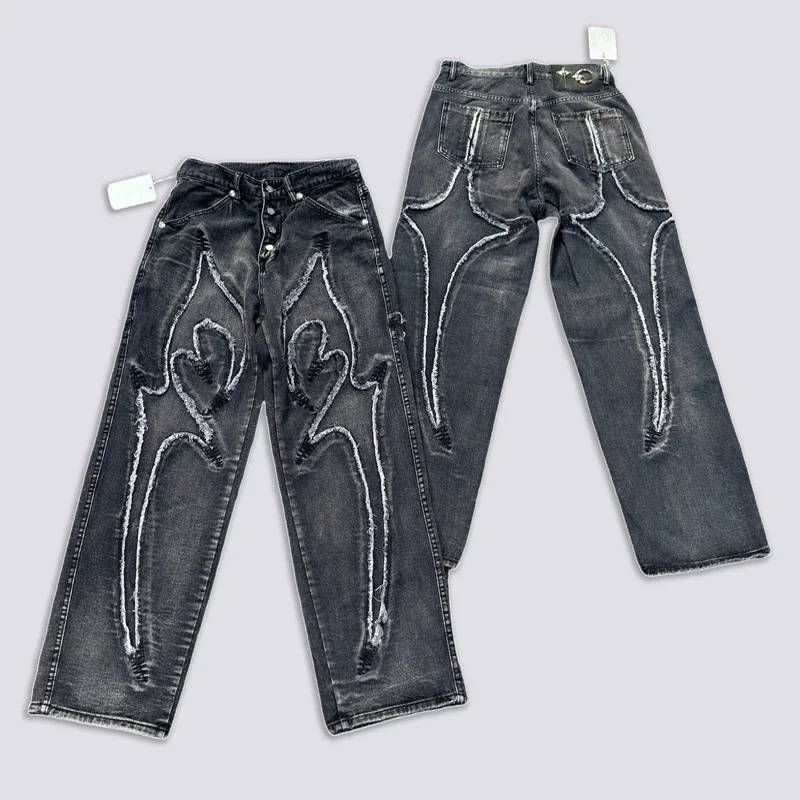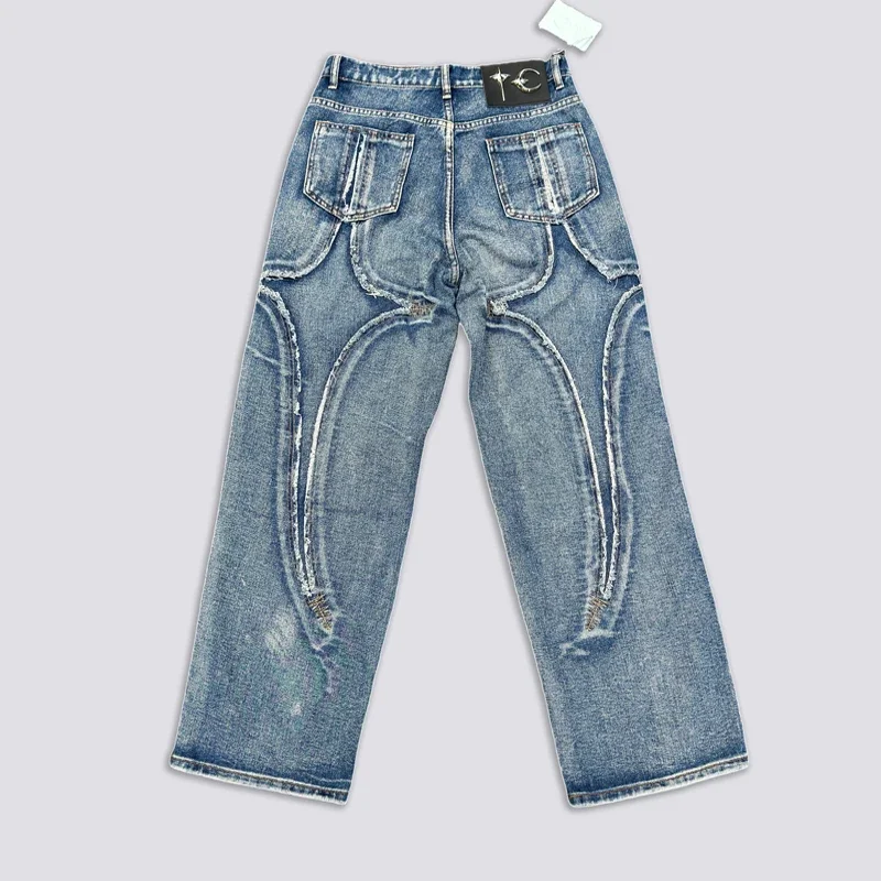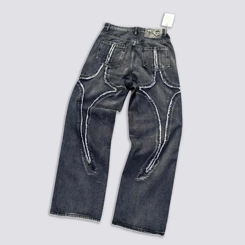 Washed THUG CLUB Embroidery Flame Tassel Jeans Men Women Casual Moon Star Metal Leather Label Loose Straight Cowboy Denim Pants