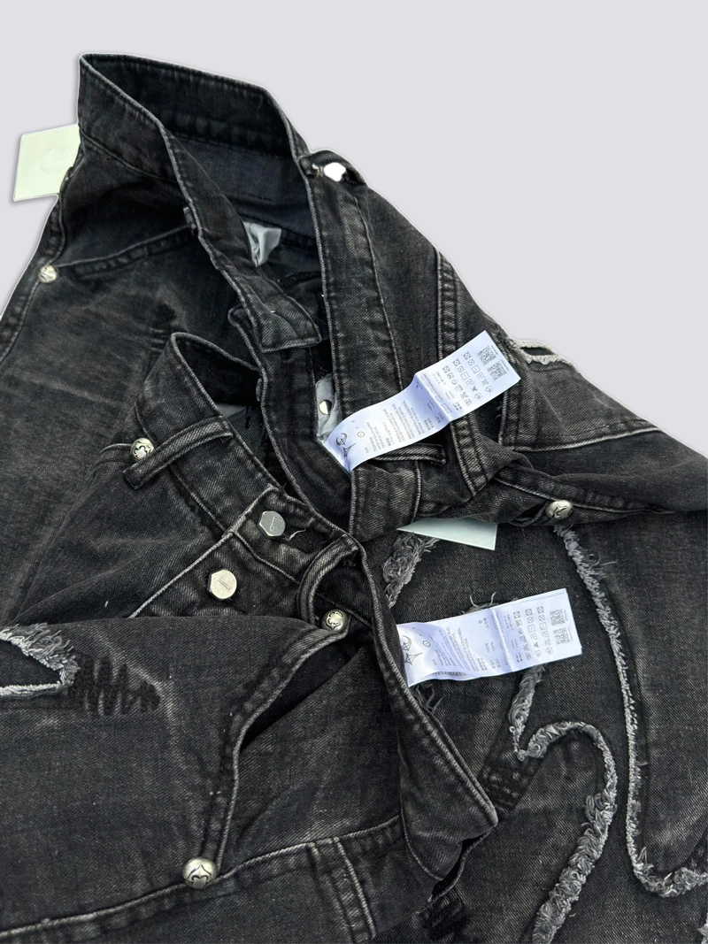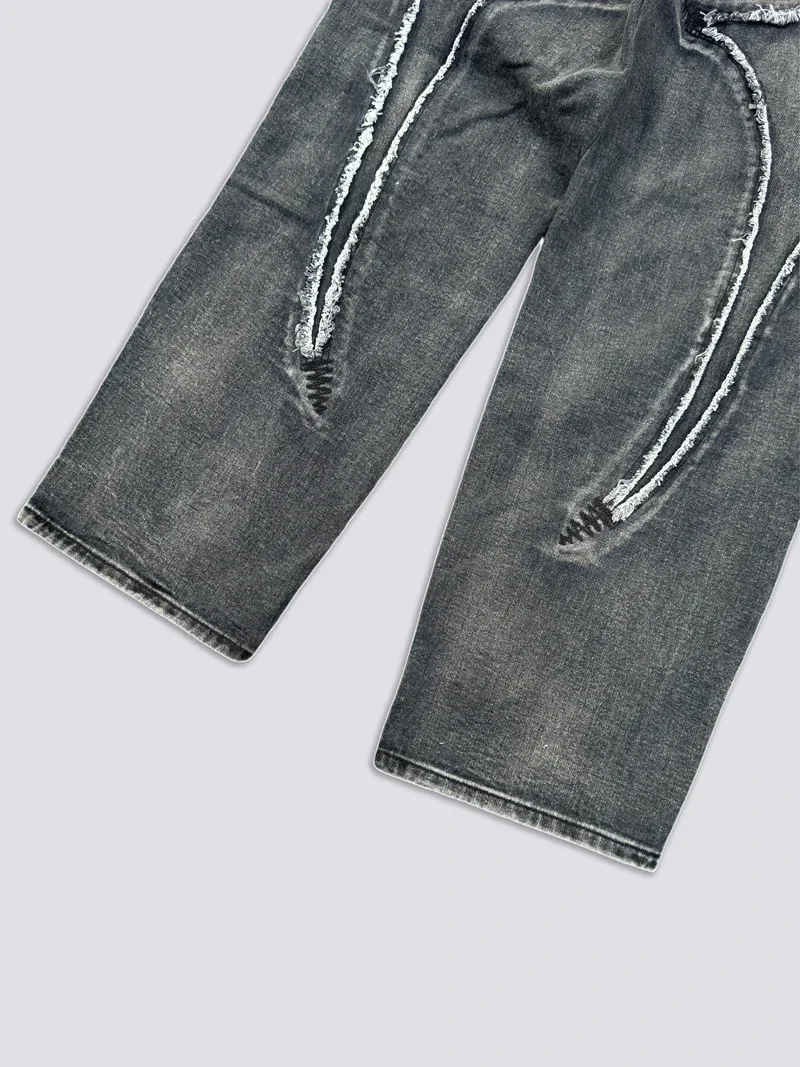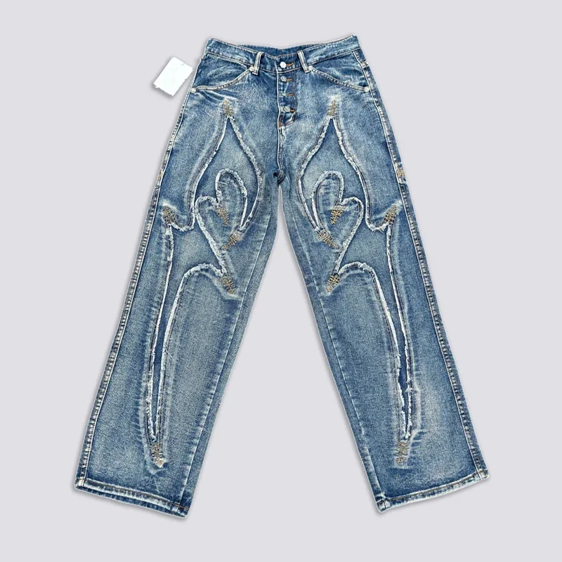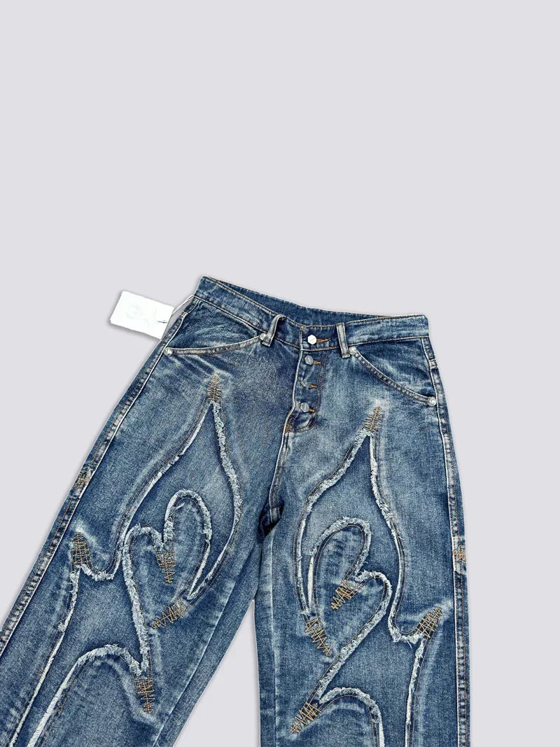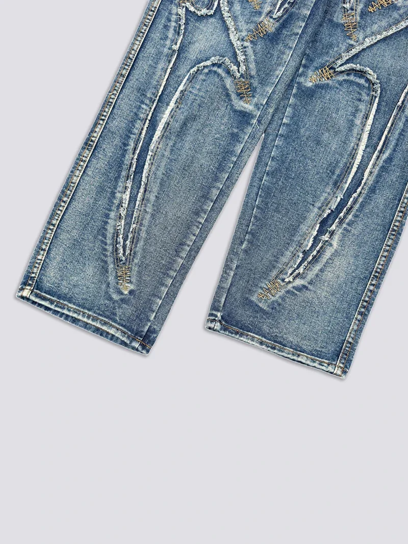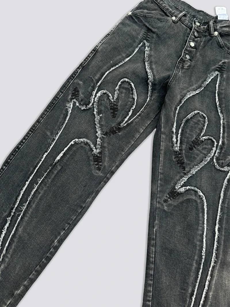 Washed THUG CLUB Embroidery Flame Tassel Jeans Men Women Casual Moon Star Metal Leather Label Loose Straight Cowboy Denim Pants