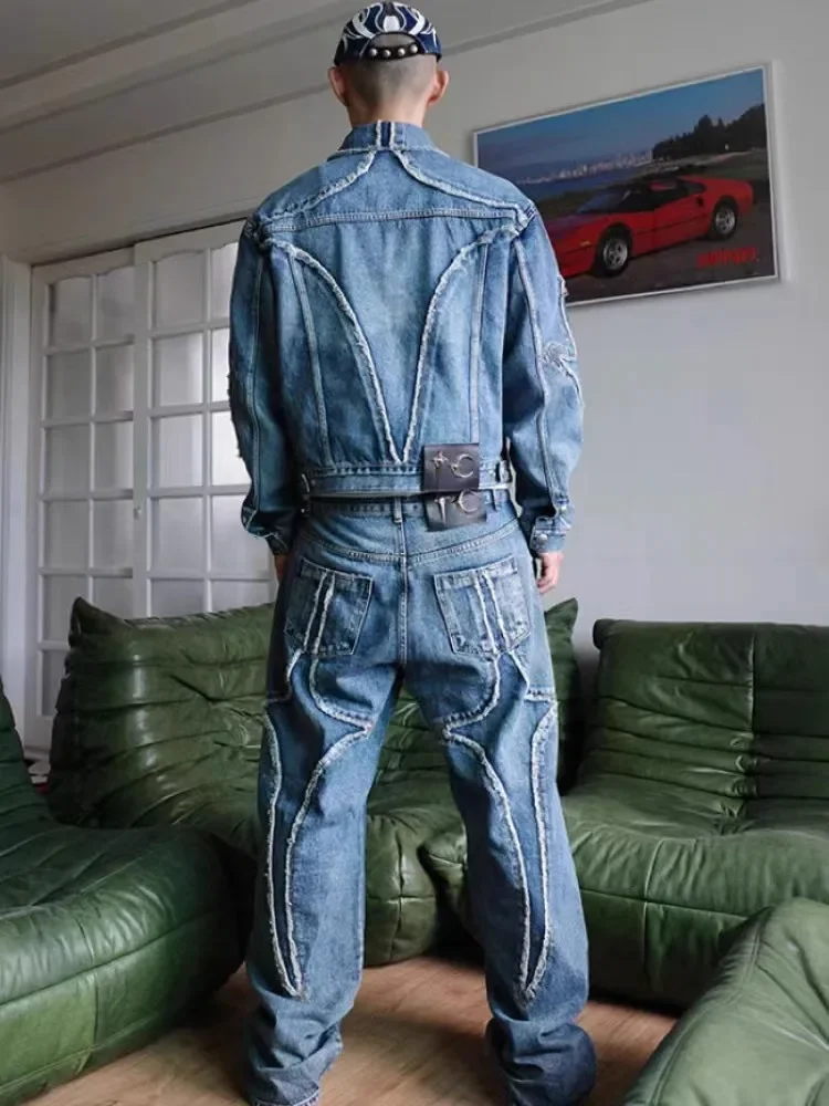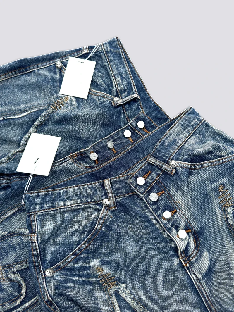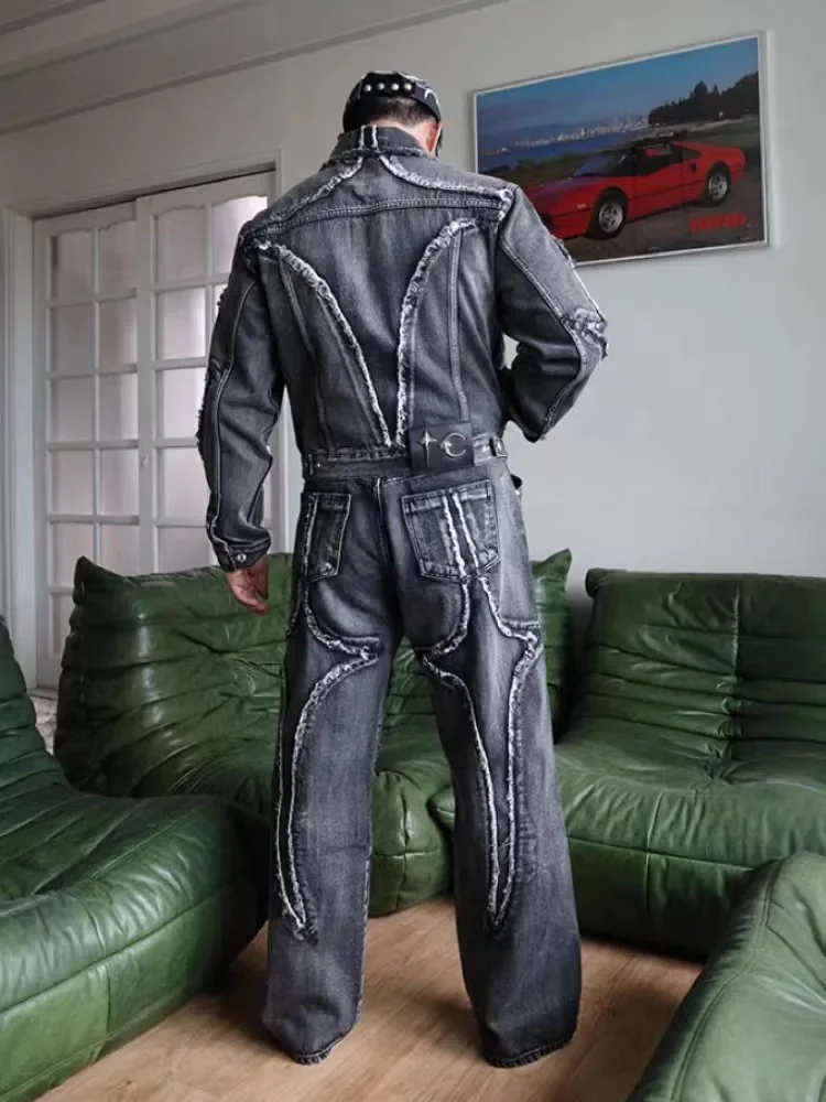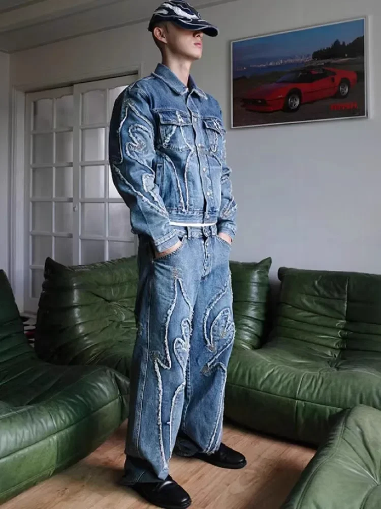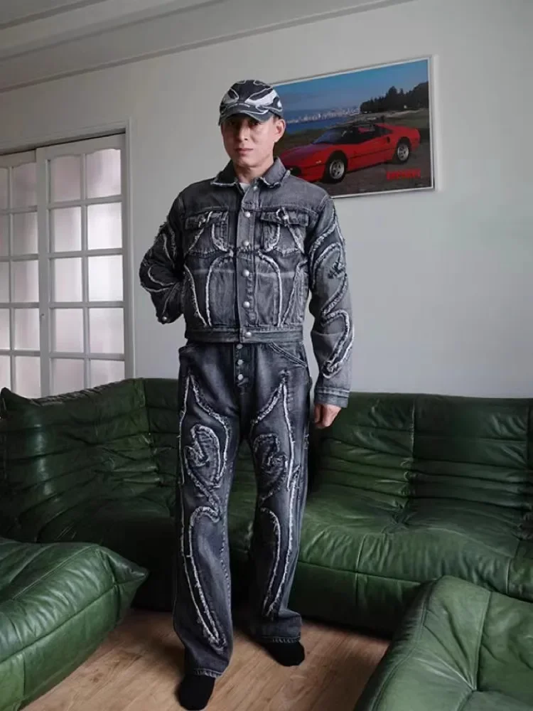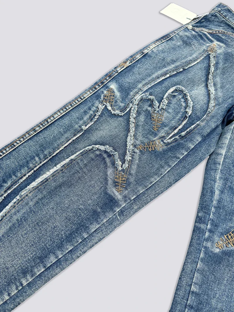 Washed THUG CLUB Embroidery Flame Tassel Jeans Men Women Casual Moon Star Metal Leather Label Loose Straight Cowboy Denim Pants