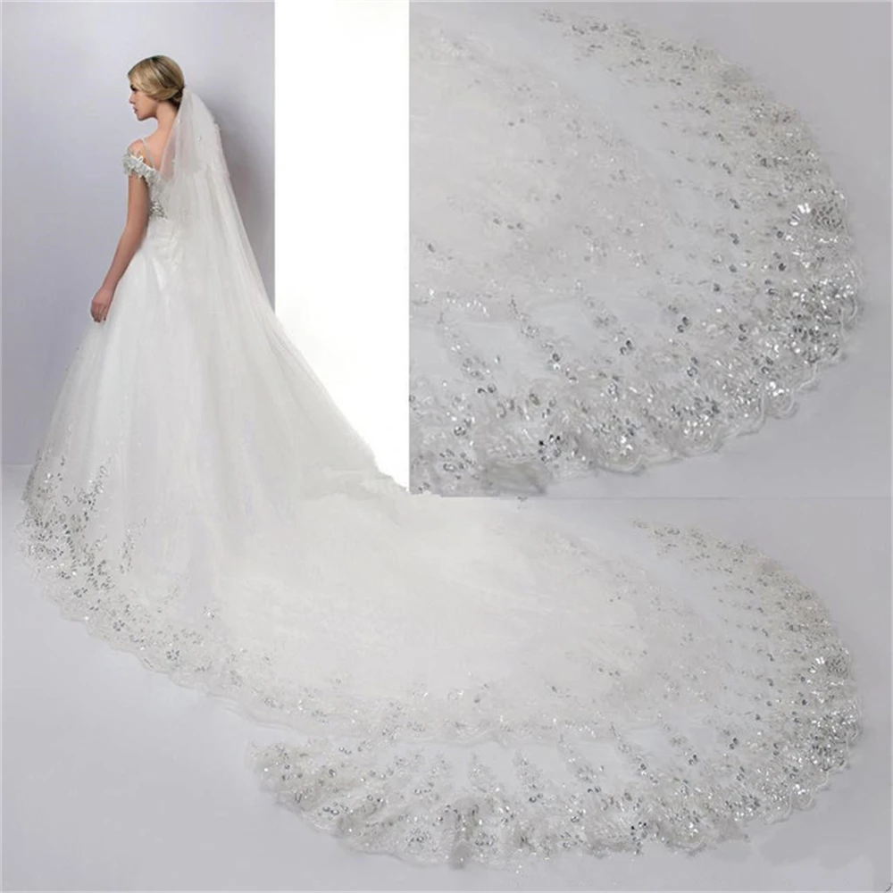 Wedding Veil Lace Edge Long Luxurious Bridal Veil Applique Sequins White/Ivory Veil With Comb Cathedral One-Layer 3Meters