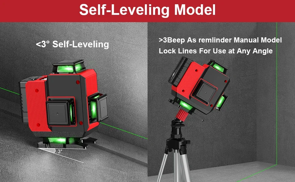 In the self-leveling mode, the laser level is automatically leveled within the range of ±3°, otherwise it will give an alarm and keep flashing. Long press the Middle key to switch from self-leveling mode to manual mode. The device can be used at any angle in manual mode.