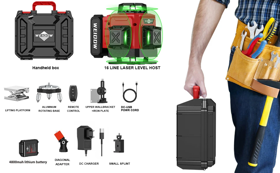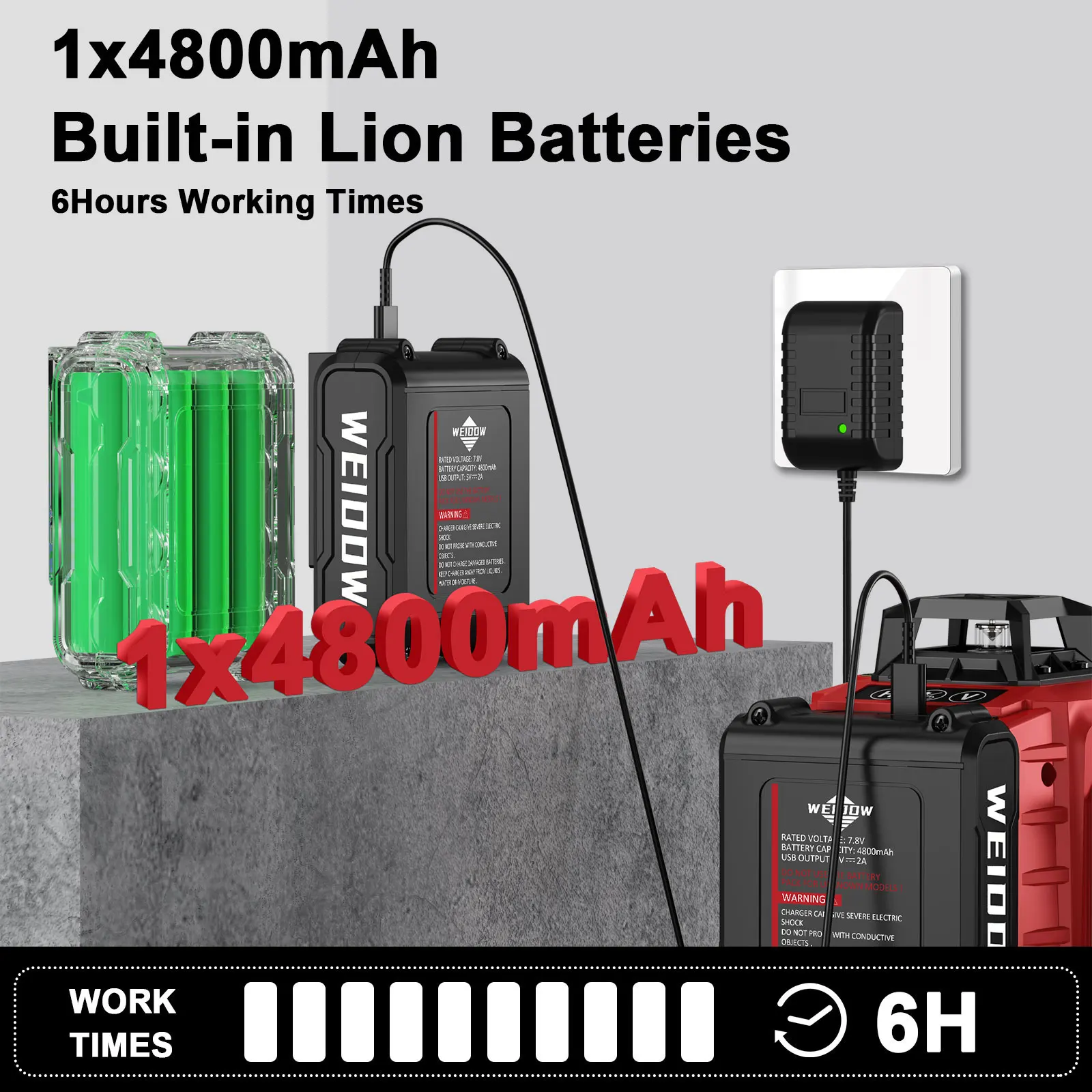 WEIDDW self leveling laser level equipped with 1 packs 4800mAh Li-ion battery,support you working up to 6 hours with 16 lines all tun on.And with the charger included,you can take the laser level out with one battery installed,and left one charging at home,make sure always have one full-charged for use.