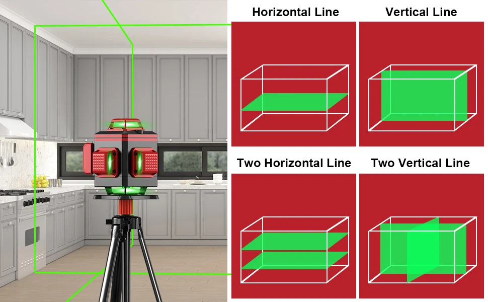 Weiddw laser level featuring four 360 planes of laser light.For ceiling installation,the top 360°horizontal line will be an ideal assistant tool,the 360° horizontal floor laser line can be used to install tile.The 360° floor laser level can travel past obstacles between 1" and 3.54" in height by lifting from the surface with the lifting base. User can quickly visualize and complete square layout by utilizing two 360° vertical lines that intersect at 90° angles.