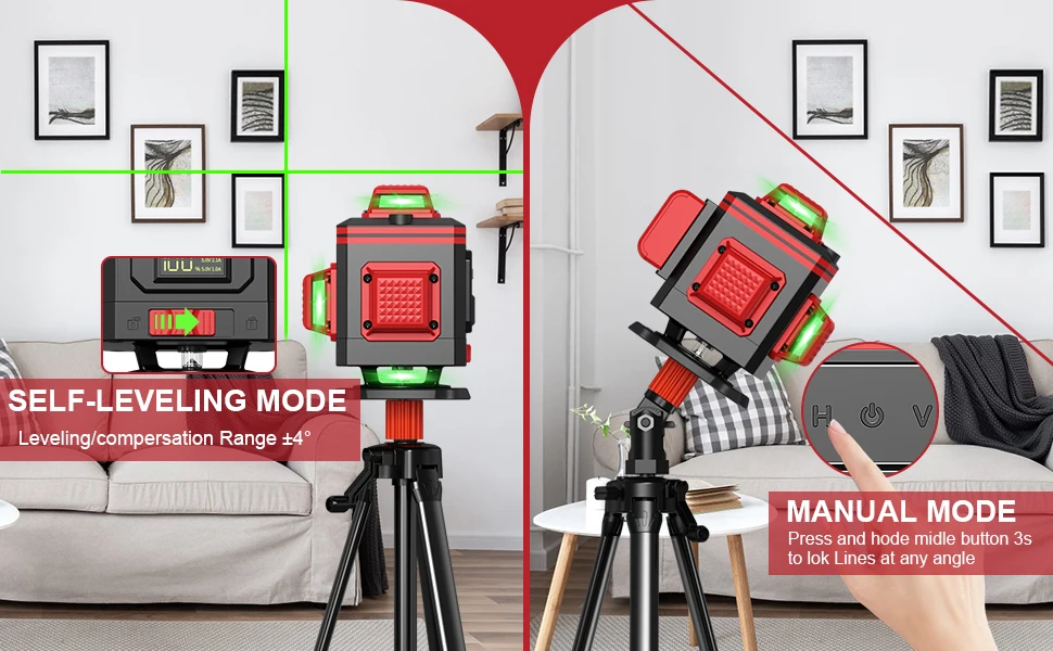 Weiddw 4D laser level line tool with smart pendulum system,the laser tool self levels and indicates out-of -level condition while pendulum unlocked.The Line level will beep when out of self-leveling range±3°.Once pendulum locked,it switches to manual mode to lock lines for use at any angle.