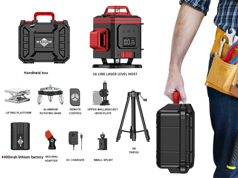 WEIDDW 4D16 Lines Laser Level with 1M Tripod Suitcase 360 Self Leveling 4×360°Green Cross Line Professional Laser for Building
