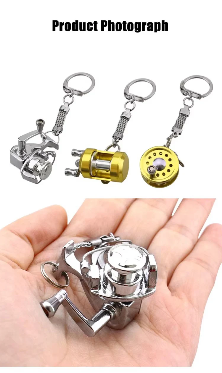 Fish Wheel keychain Gold Color Fly Fisherman Spinning Fishing Reel Charactor Miniature Key chain With Key Ring
