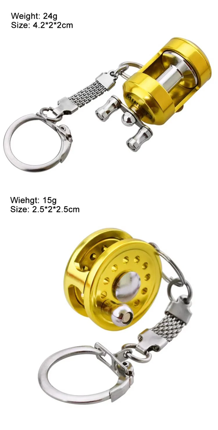 WEIHE Strong Fish Wheel Keychain Gold Color Fly Spinning Fishing Reel Miniature Key Chain With Key Ring