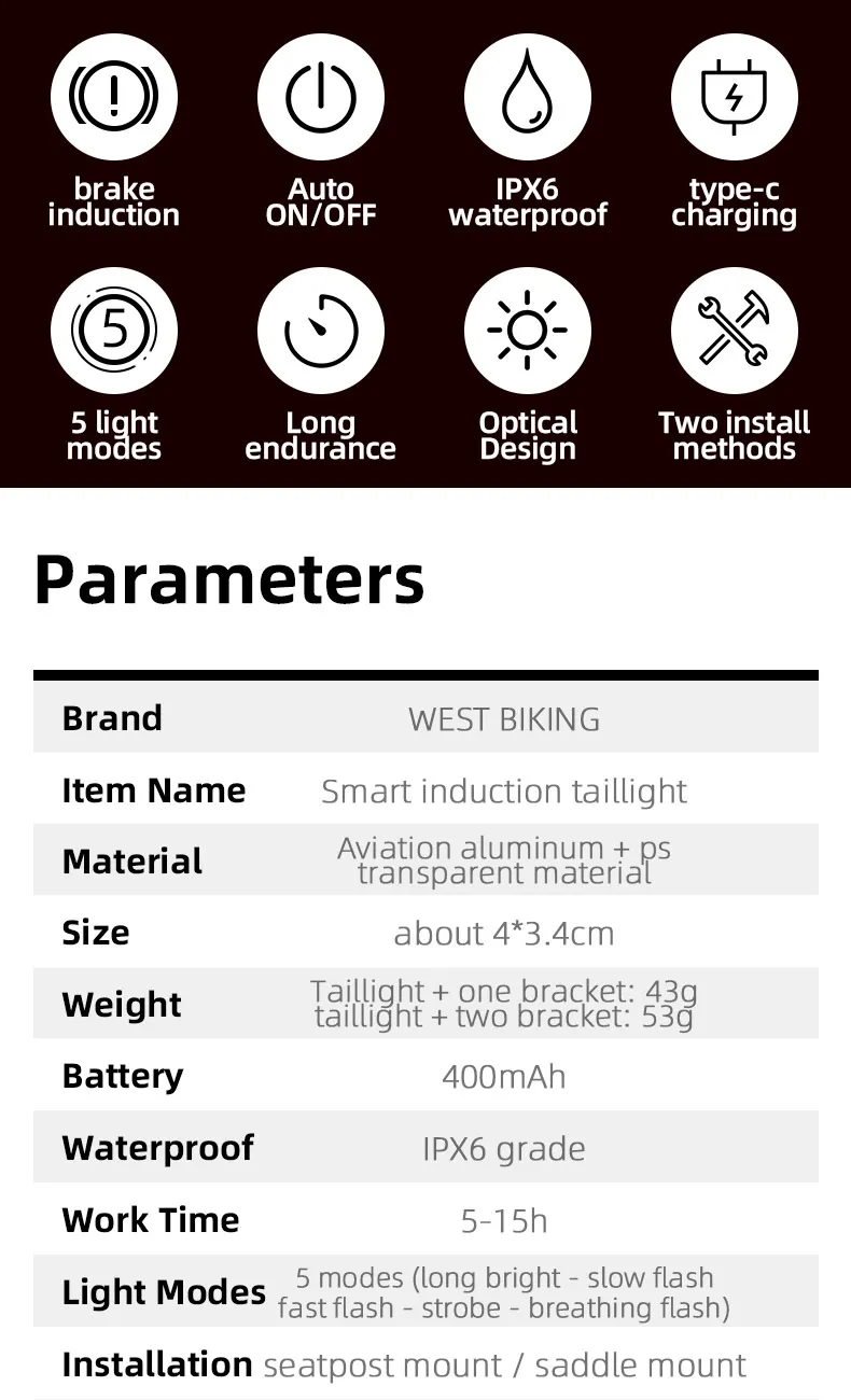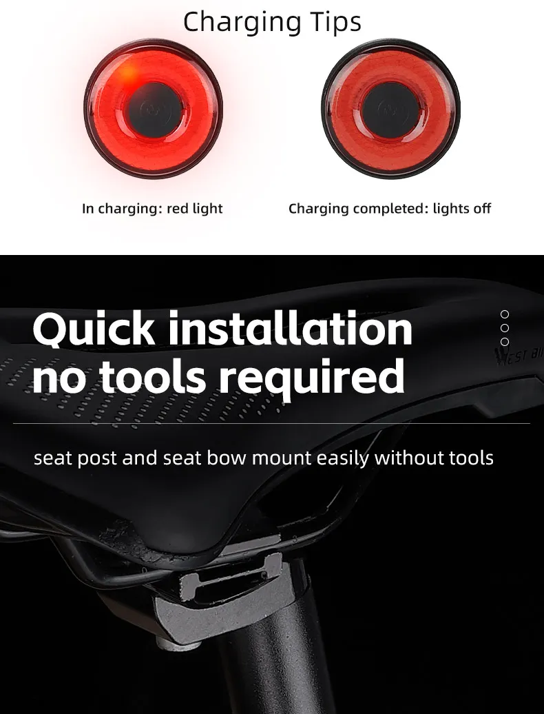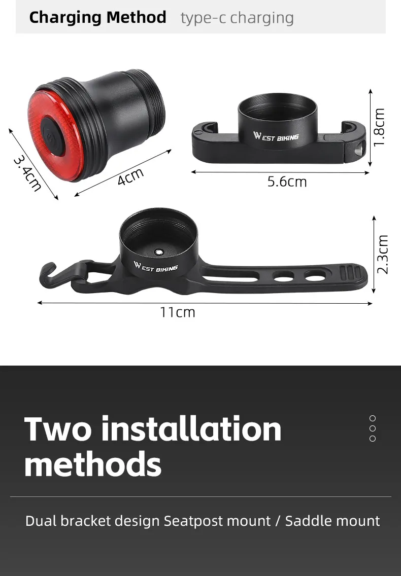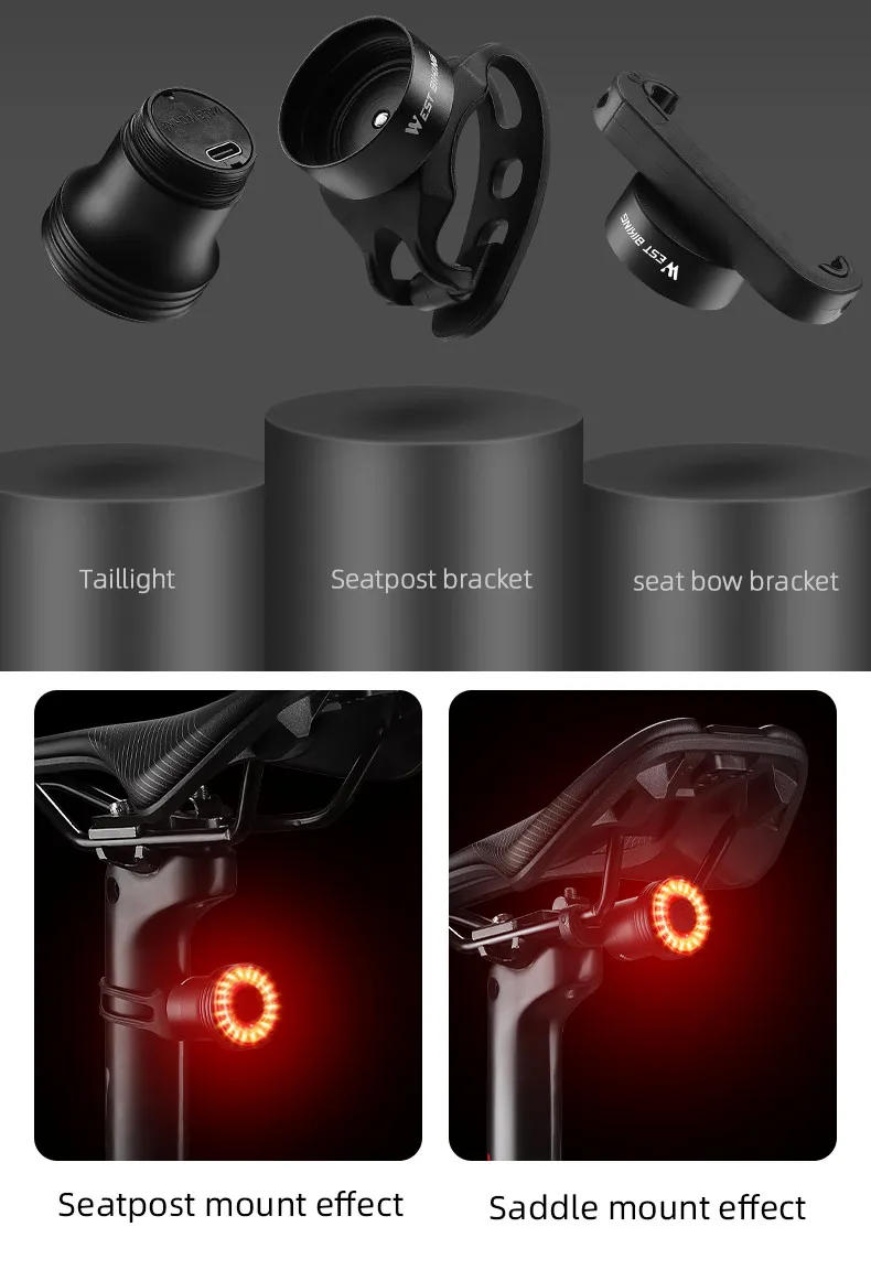 WEST BIKING Smart Bike Tail Light Brake Sensing Rear Light Quick Release Type-C Charging Cycling Taillight Bicycle Accessories