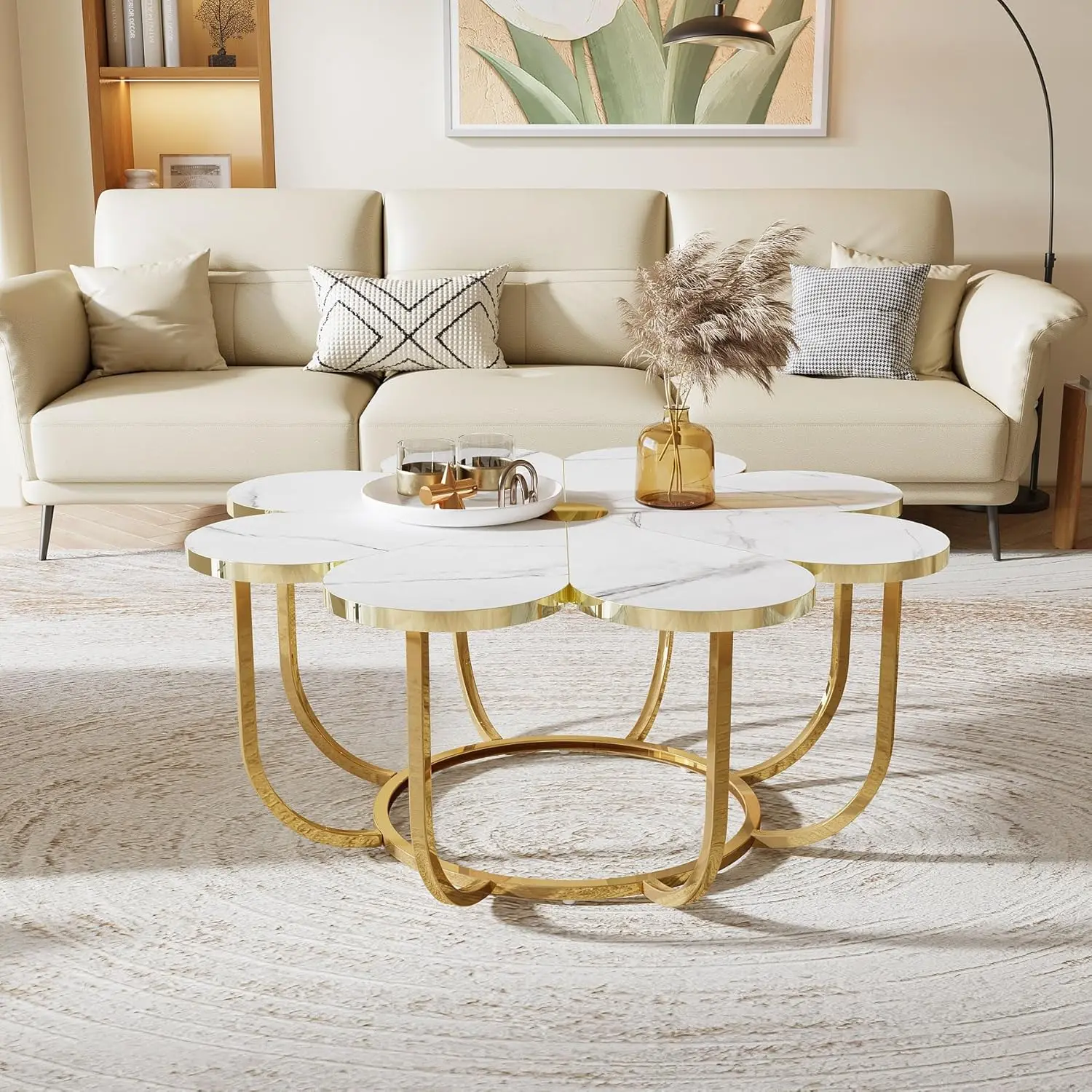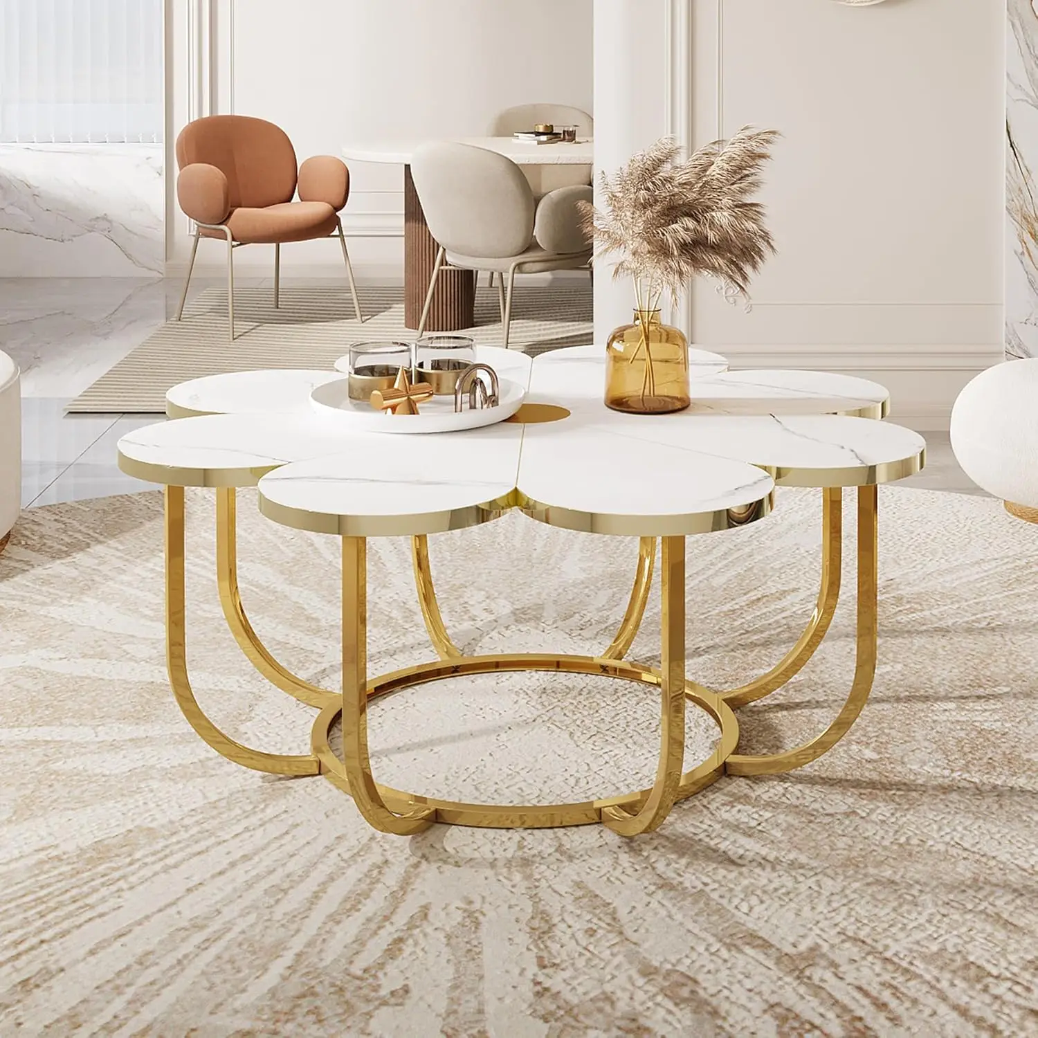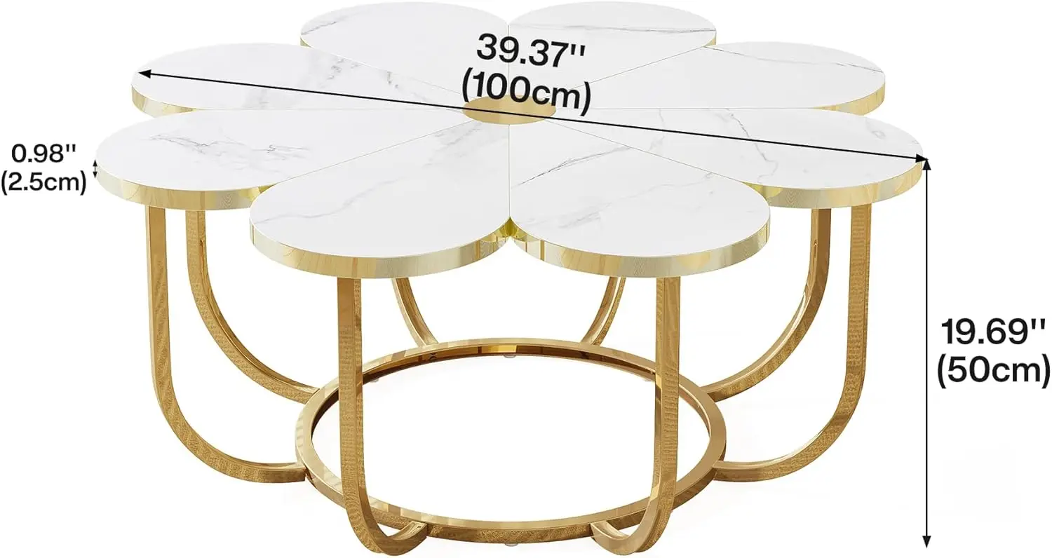 White and Gold Coffee Table, Modern Flower-Shaped Coffee Table with Faux Marble Tabletop, 39.37-Inch Floral Accent Center Table