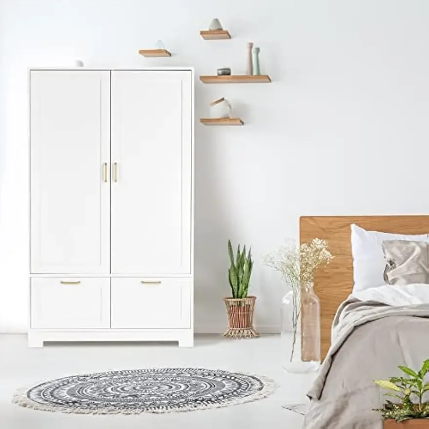 - 【Versatile Design】The wardrobe armoire features a stylish white woodgrain finish, gold metal handles, and frame panel doors, making it a perfect fit for various home decoration styles such as modern, contemporary, farmhouse, or casual