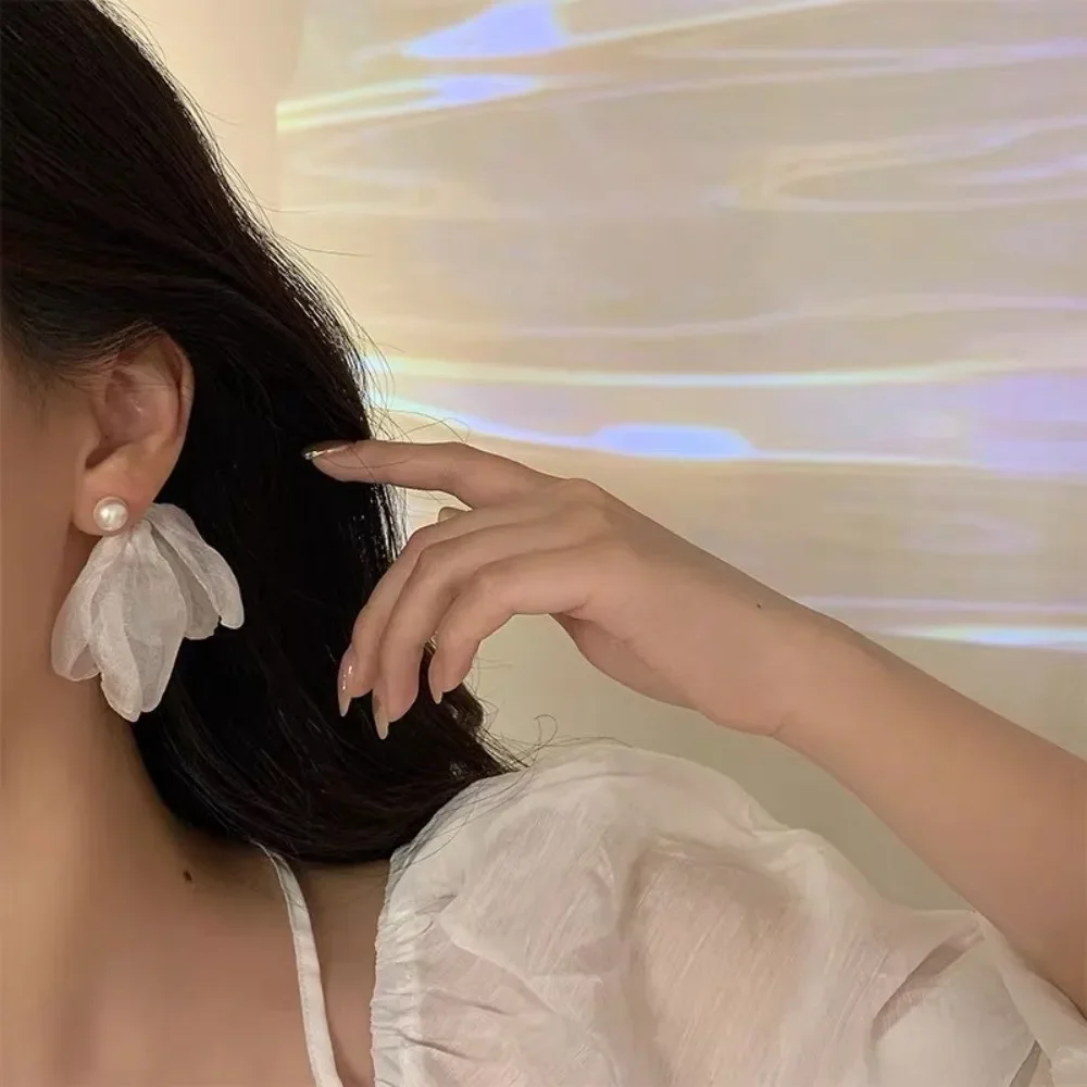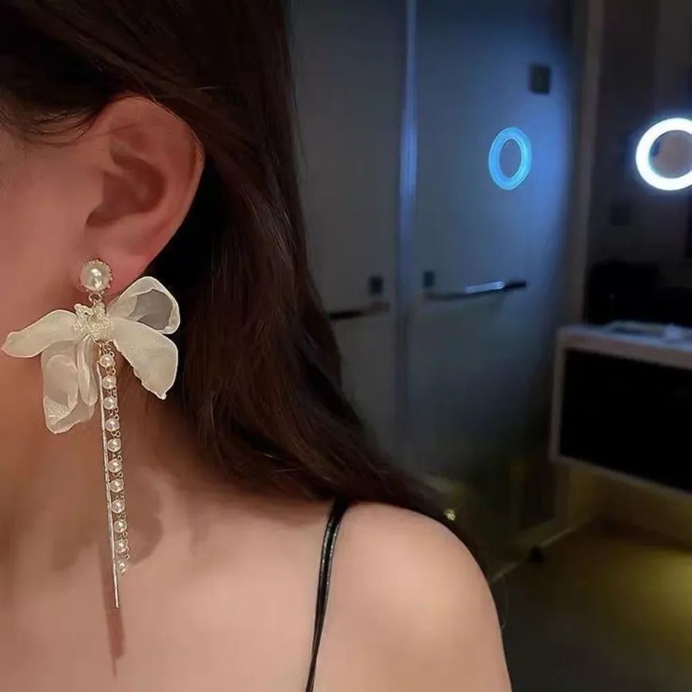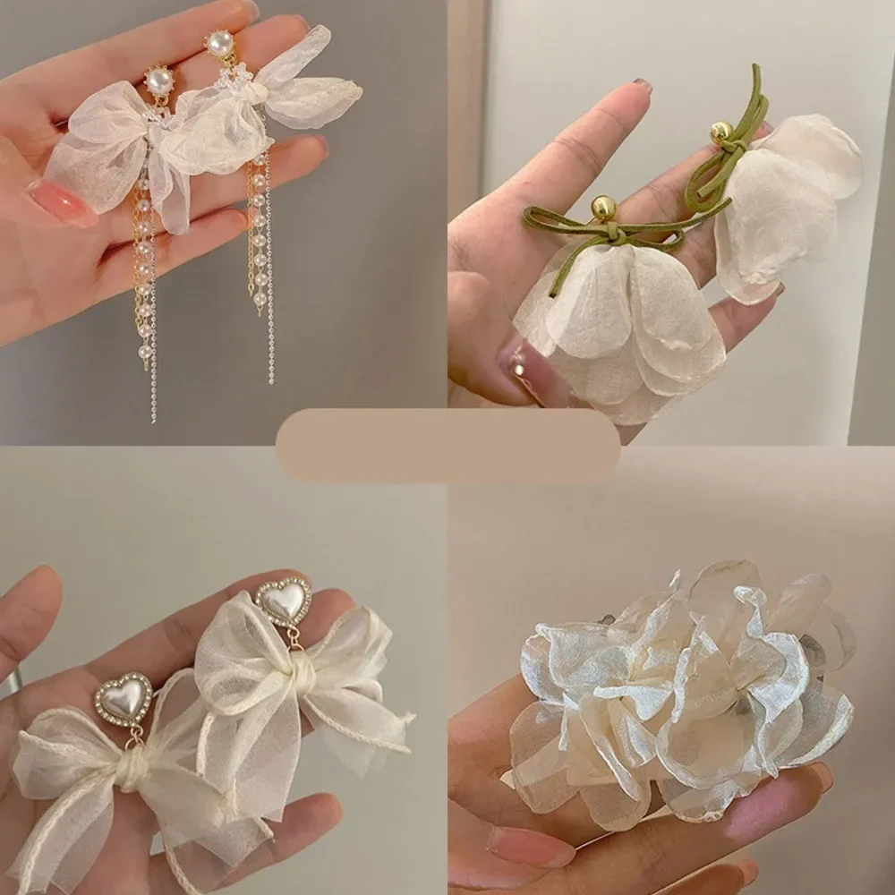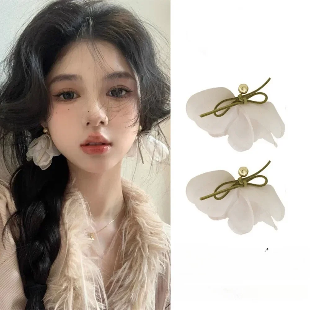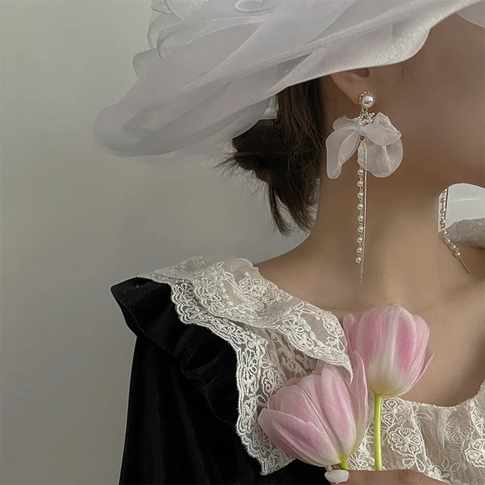 White Chiffon Flower Tassels Drop Earrings for Women Spring Summer Sweet Girls Fairy Bowknot Studs Earring Jewelry Accessories