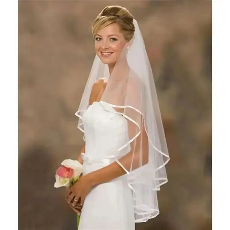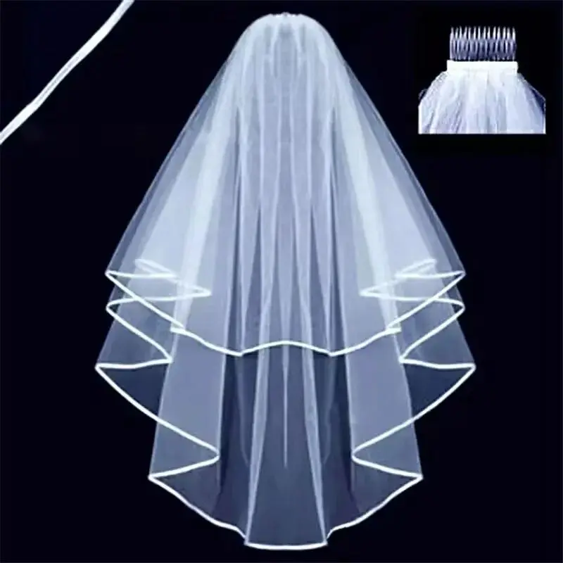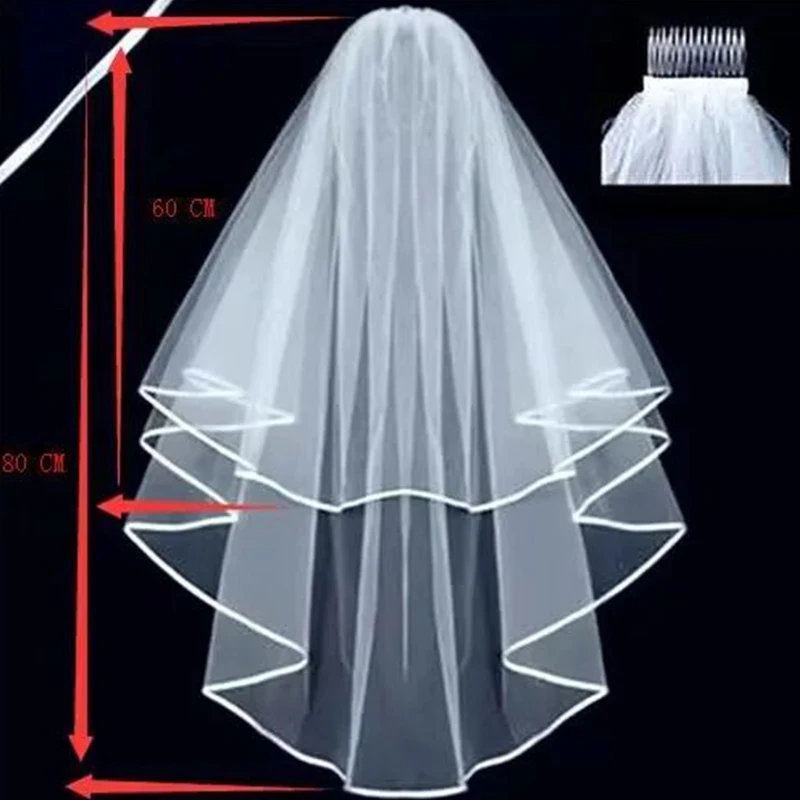 White Ivory Wedding Veil 2 Tiers Ribbon Edge Center Cascade Bridal Veil with Comb for Bachelorette Party