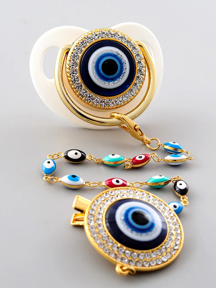 White Pacifiers Evil Eye With Chain Clip Newborn Silicone Pacifier Gold Bling Infant Nipple BPA Free Baby Chupetero