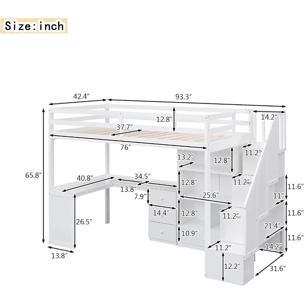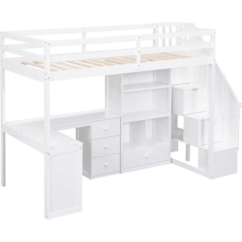 White Twin Size Loft Bed with Staircase and L-Shaped Desk, Wooden Loft Bed with Storage Shelves, Twin Loft Bunk Beds Frame