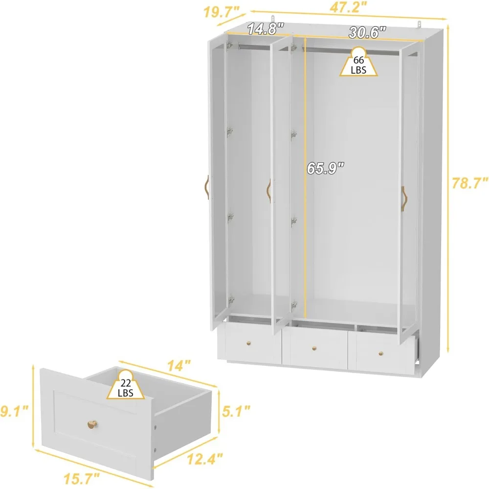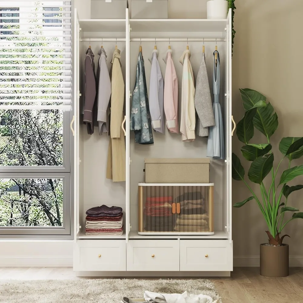 - Ample Storage Space – This wardrobe armoire closet equipped with 3 clear glass doors, your can easily locate your clothes, and protect your stuffs from dust. The large hanging space is ideal for longer and wrinkle-prone clothing. And drawers are great for shirts, bags, lotions, or perfumes