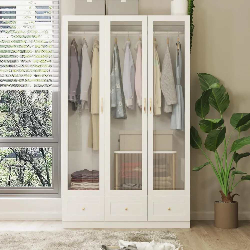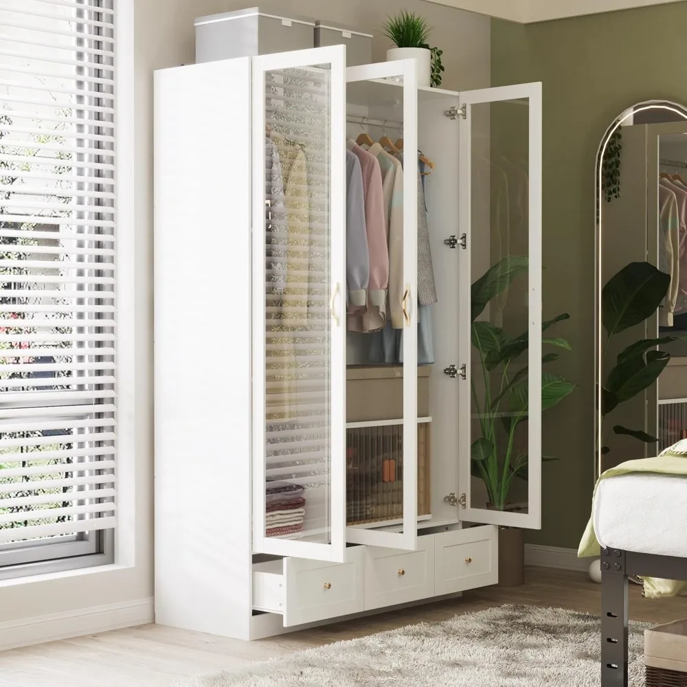 White Wardrobe Cabinet with Glass Doors, Wooden Armoire Closet with 3 Drawers & 2 Hanging Rod, Bedroom Armoire for Storage