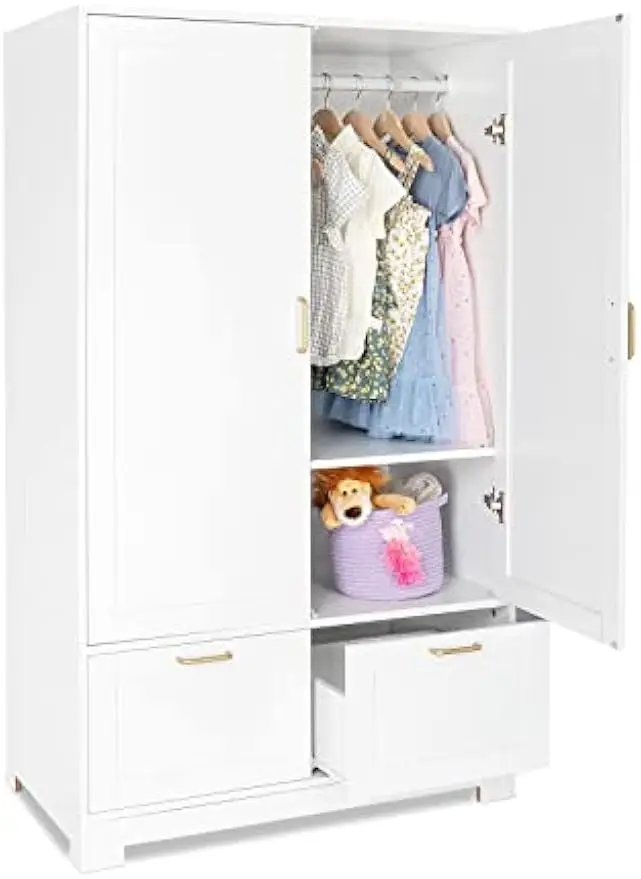 - 【Versatile Design】The wardrobe armoire features a stylish white woodgrain finish, gold metal handles, and frame panel doors, making it a perfect fit for various home decoration styles such as modern, contemporary, farmhouse, or casual