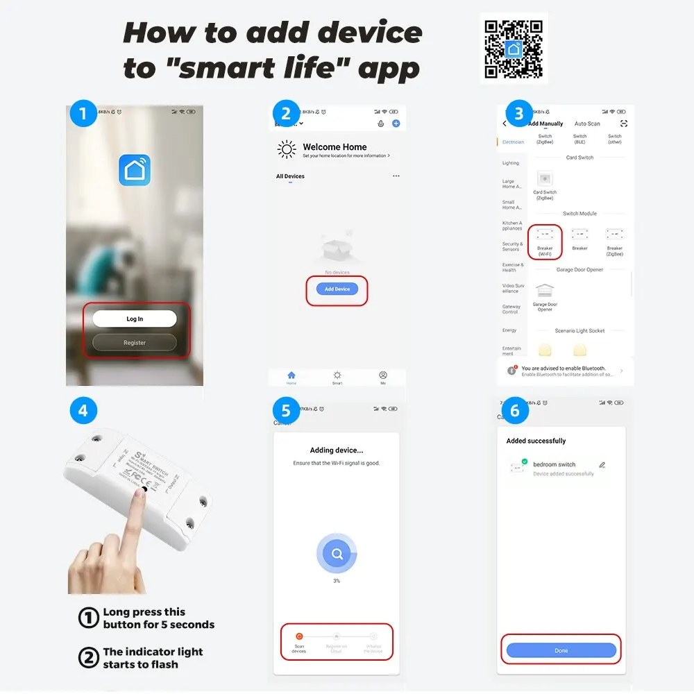 4. If the indicator light of the smart switch is not flashing red light, please press the button of the smart switch and keep it for more than 5 seconds until the red light flashes continuously, then open the APP and connect to the WiFi according to the manual.